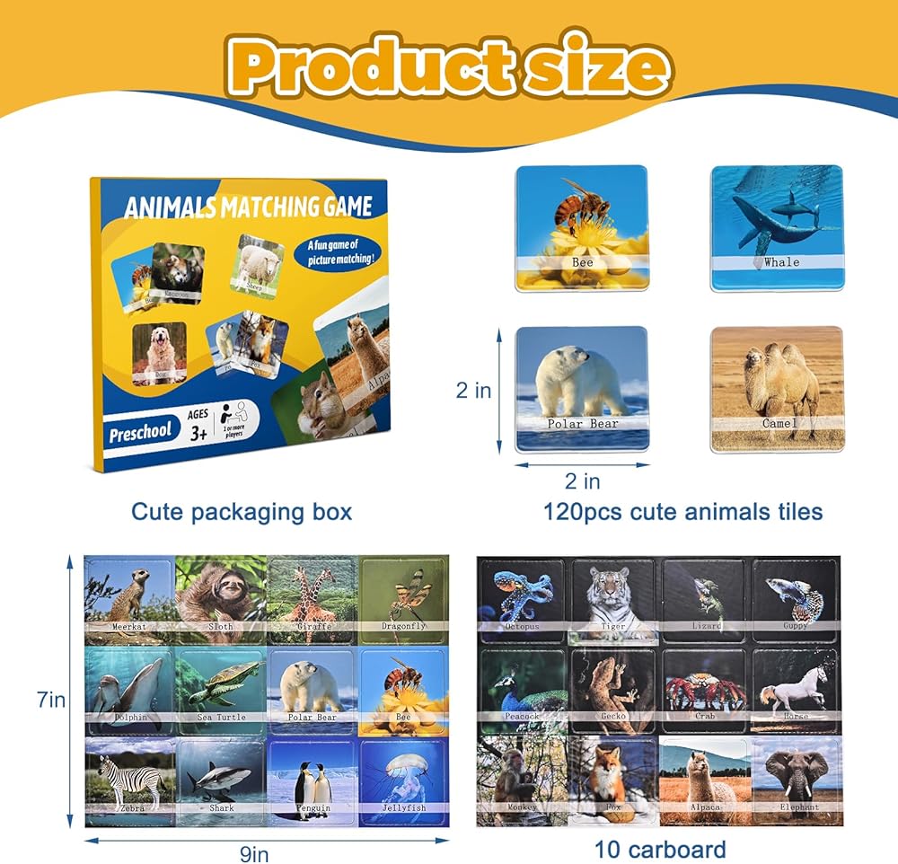3. Rich Animal Patterns: With a total of 120 cards and 60 pairs, each measuring 2"x2", your child can better acquaint themselves with the natural world while having fun.