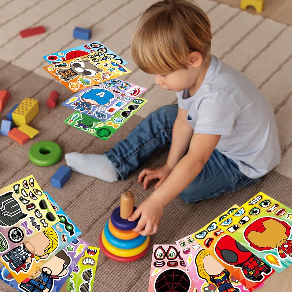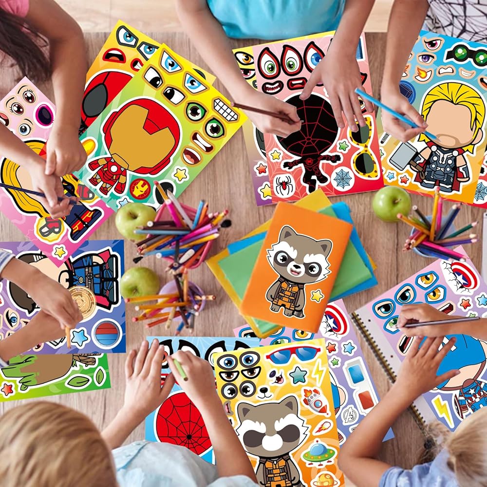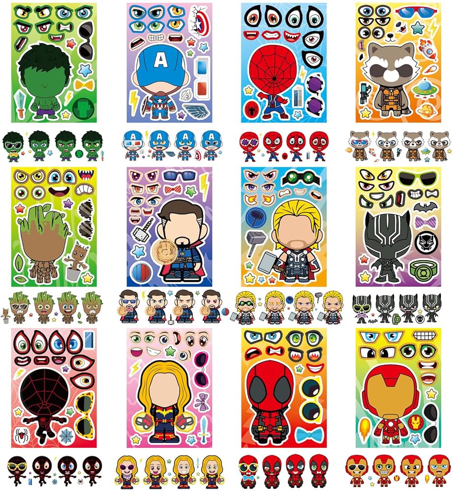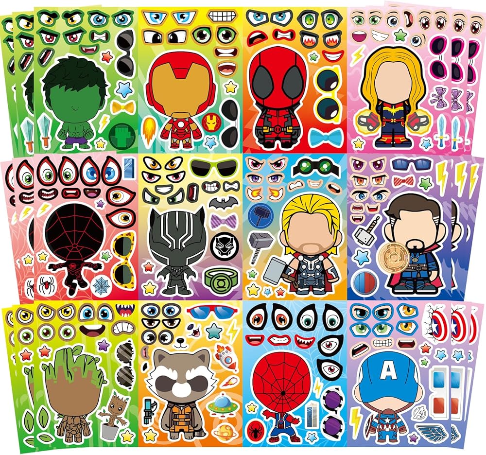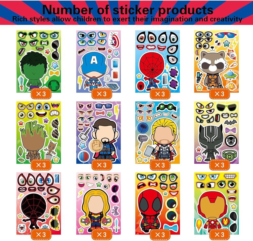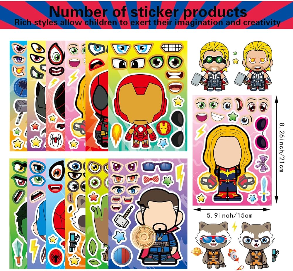 Package includes: 36 pieces stickers in total, 9 Heroes characters, 4 pieces for each characters. Make a face stickers: The pile of lovely making face stickers is great gift for kids. You can stick them on any smooth surface, such as laptop, bedroom, cabinet, closet, table, refrigerator, notebook, etc. Premium Quality PVC Stickers: Non-toxic, Odorless and Waterproof. It's specially made for kid's party. Stickers' surface has protective film and lubricating coating so that small matching stickers can be re-used. Size: The make a face sticker size is: 8.3*5.9 inches. We always ensure 100% customer's satisfaction, any questions just feel free to send me a message