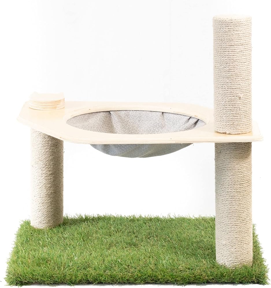 تتضمن ثلاثة (3) أعمدة خدش للقطط مغلفة بالسيزال وقاعدة حصيرة من العشب الفلكي للاستخدام الداخلي. يتم تضمين أربعة (4) انزلاقات تسوية في الجزء السفلي من القاعدة لمزيد من الثبات.