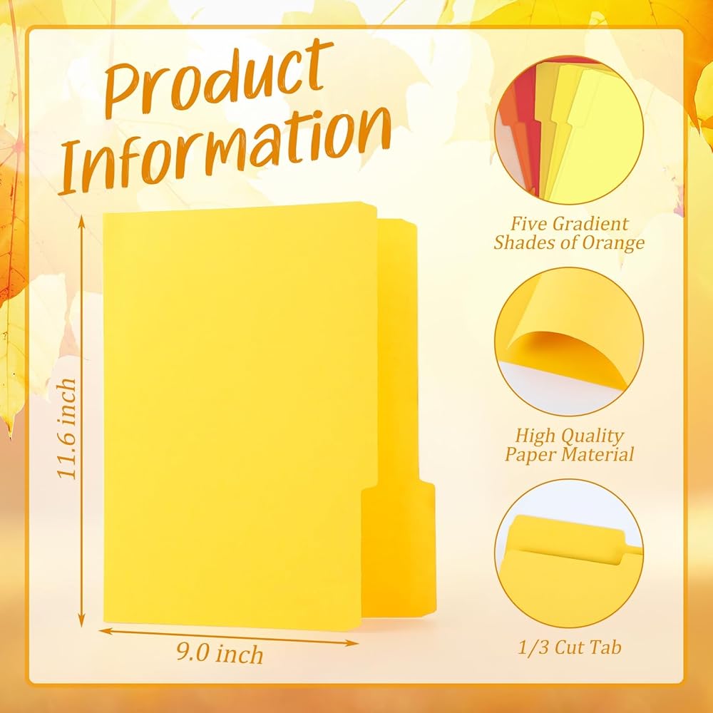 • Good Gift Choice: our file folders are composed of five shades of orange gradient colors from dark to light, which can create a festive atmosphere for autumn and Thanksgiving. They can be used as a gift for colleagues or friends to welcome the upcoming autumn festival together.
