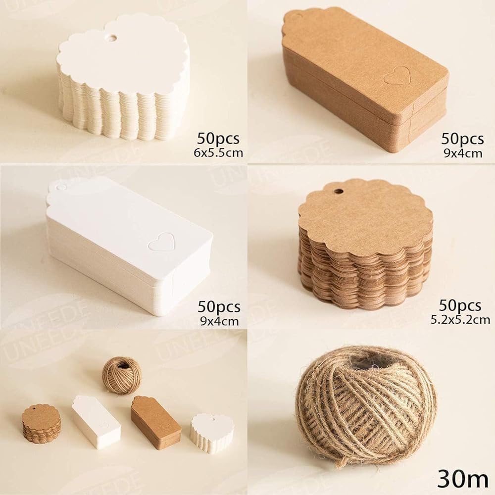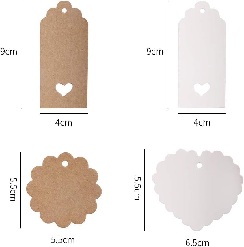 Suitable Size: The Rectangular paper tags size is 9x4cm/3.54x1.57inch and heart tags 6x5cm/2.36x1.97inch, Scalloped 5.5x5.5cm/2.17x2.17inch, easy to carry and store , 16 feet Jute twine string and 16 red and white color string rather than pre-cut strings, you can cut as your need length