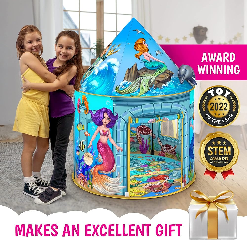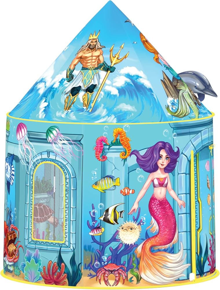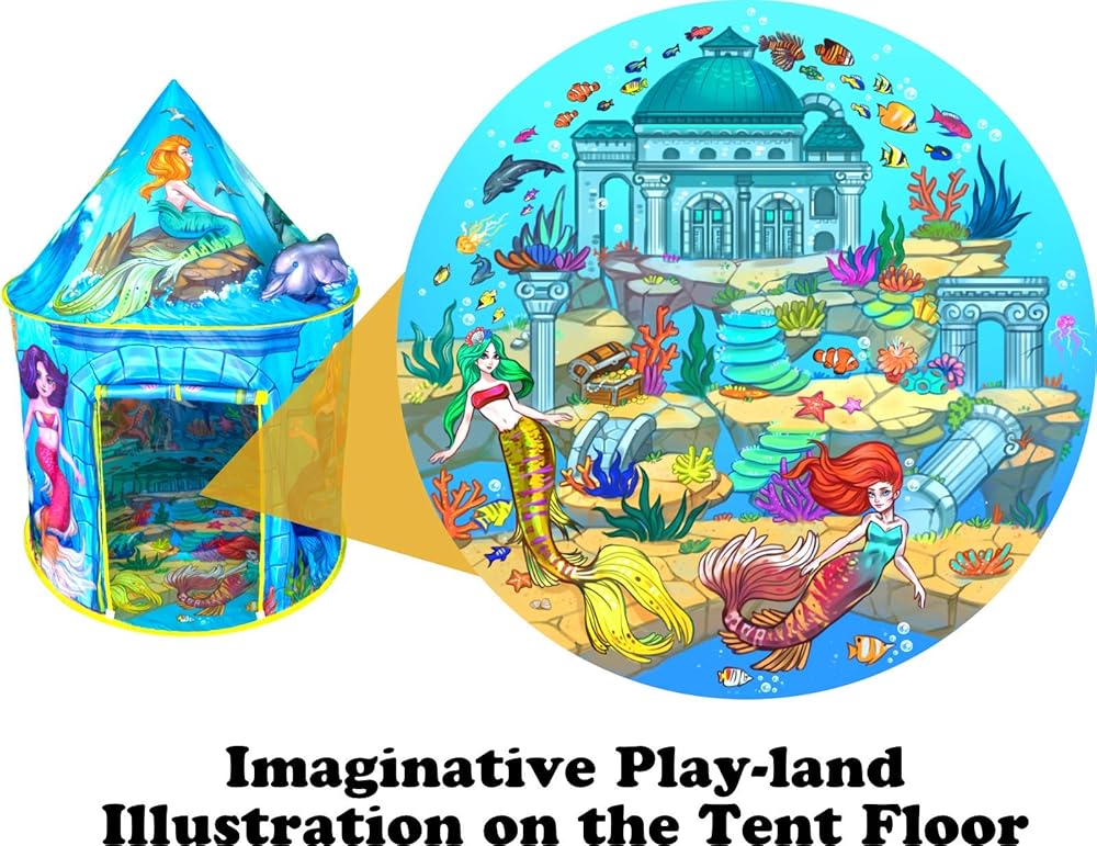 ULTIMATE MERMAID TENT: Vibrant detailed illustrations will let your child's imagination soar! It will become the centerpiece of your child's magical play-land. They will have a world of fun surrounded by numerous Mermaids, fish, corals and so much more. Illustrated floor features a playland to play with dolls.