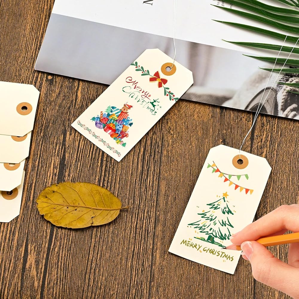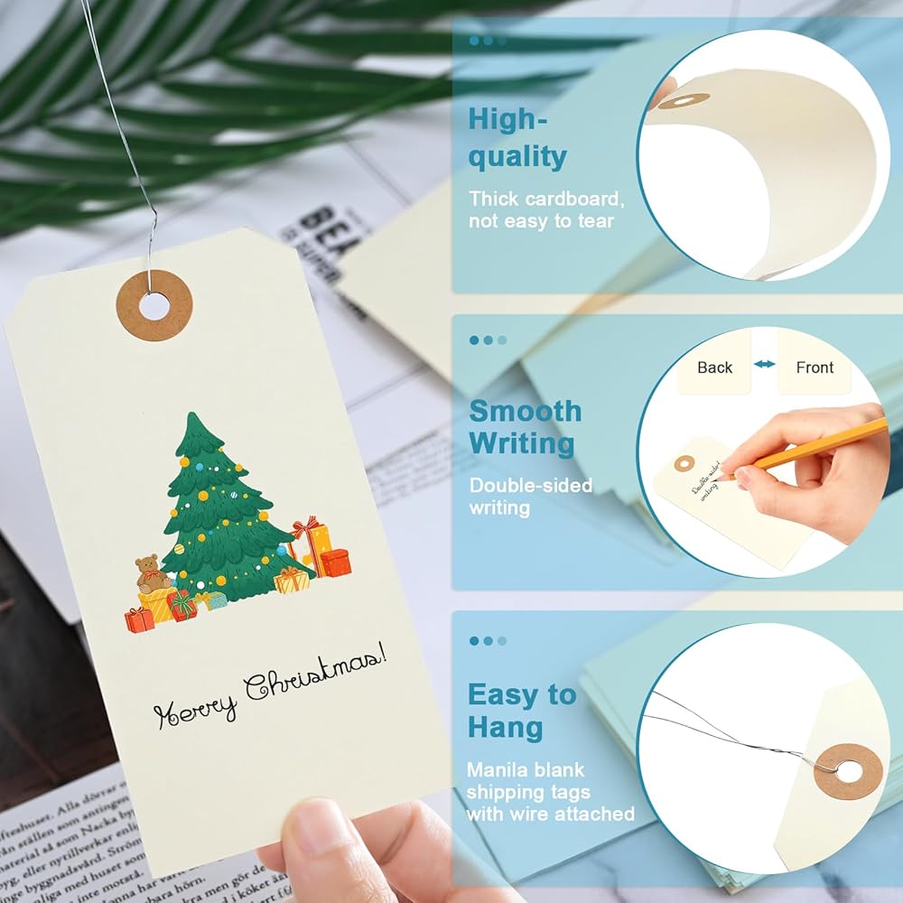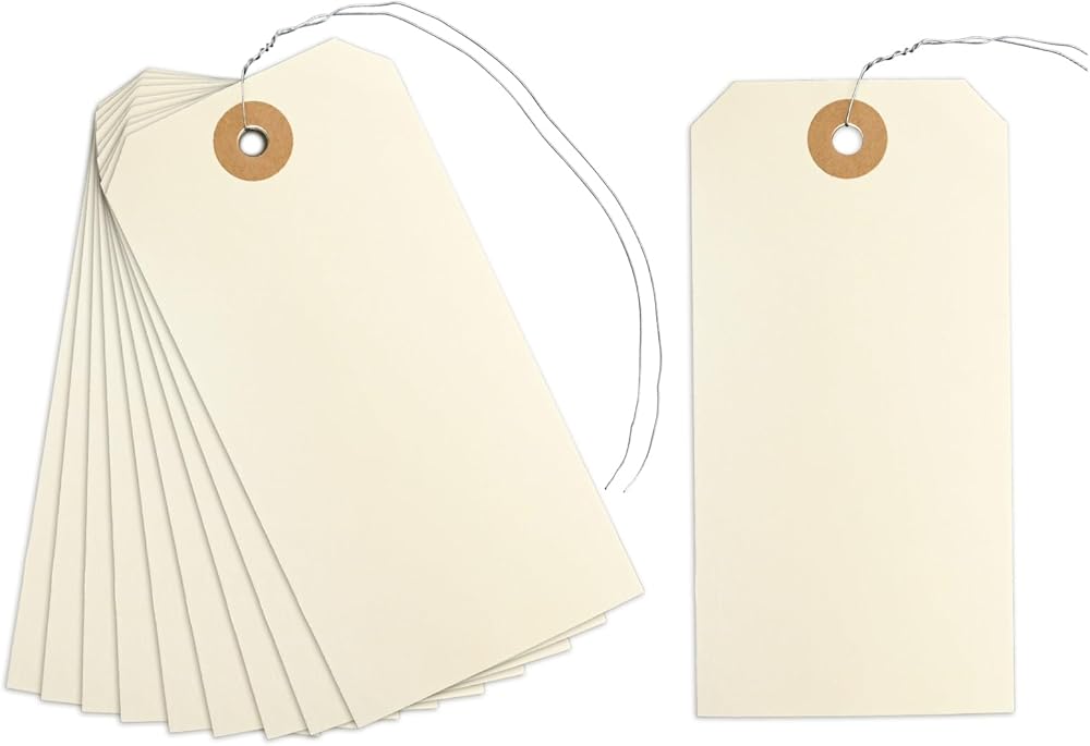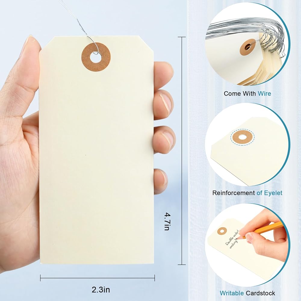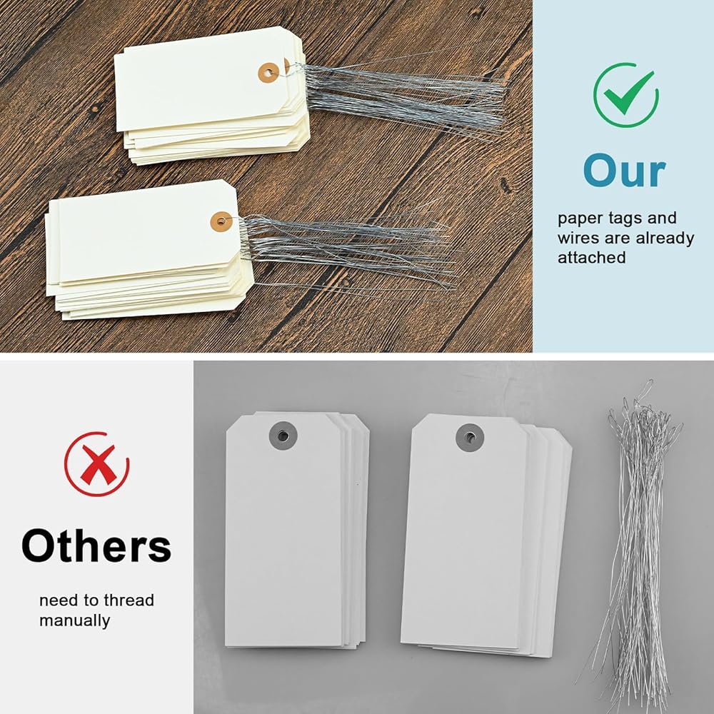 Package Includes: 120pcs manila shipping tags and 120pcs metal wire. Manila paper tags and wires are already attached, no need to thread them manually