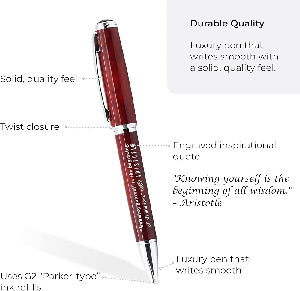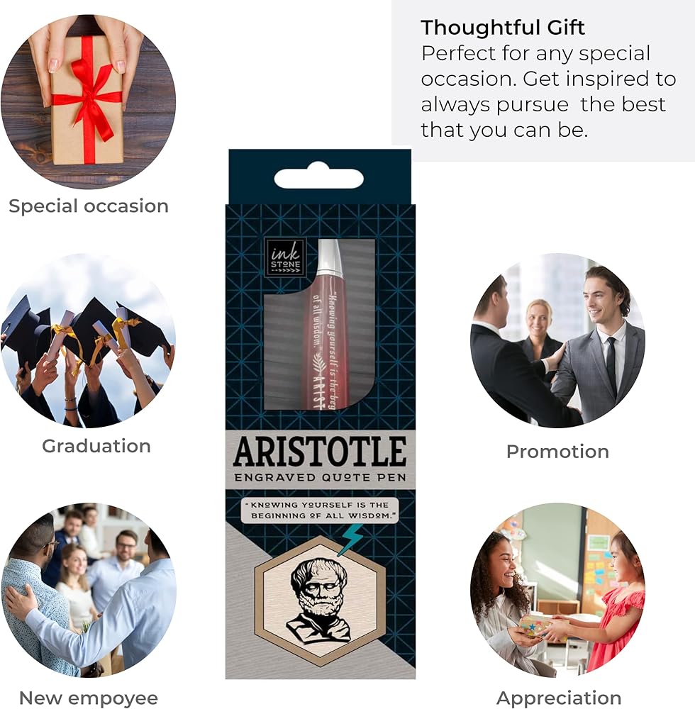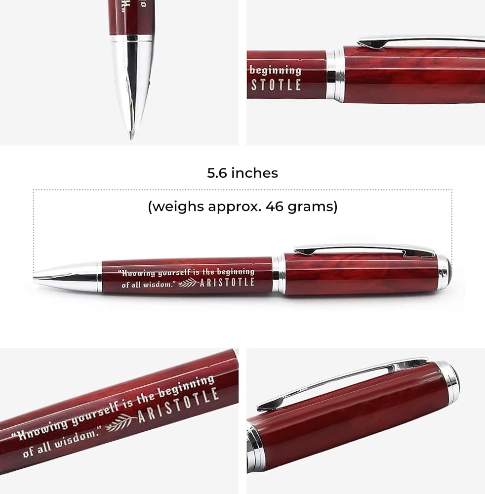 This Aristotle engraved philosophy quote pen is engraved with his famous inspirational quote, "Knowing yourself is the beginning of all wisdom." This collectible pen makes a suitable gift for philosophy nerds, teachers, history lovers, and creative people of all types. It weighs 30 grams and measures approximately 5.5 inches long. The replaceable ink cartridge offers an alternative to disposable ballpoint pens. This pen fits the standard G2 ballpoint pen refills, also known as Parker-type refills. The inspirational quote is suitable for commemorating occasions such as graduation, birthday, and Christmas.