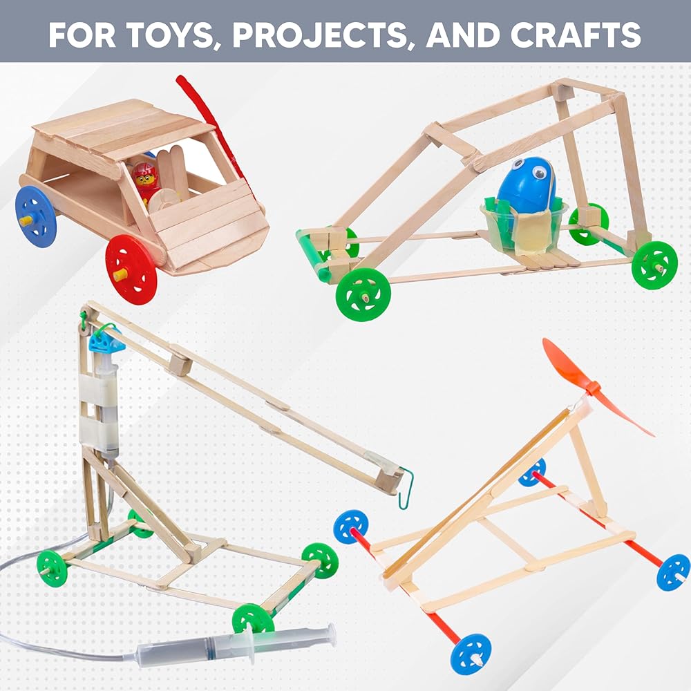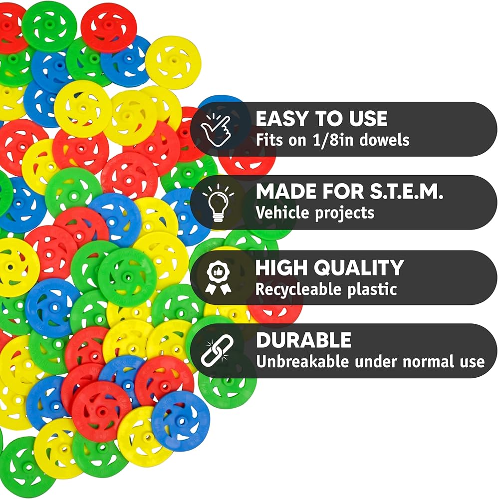 من السهل العمل مع! إذا كنت قد قمت ببناء مشروع سيارة باستخدام أقراص مضغوطة للعجلات، فأنت تعرف حجم المتاعب. تتناسب هذه العجلات بشكل مريح مع المسامير الخشبية القوية - سهلة الاستخدام للأطفال!