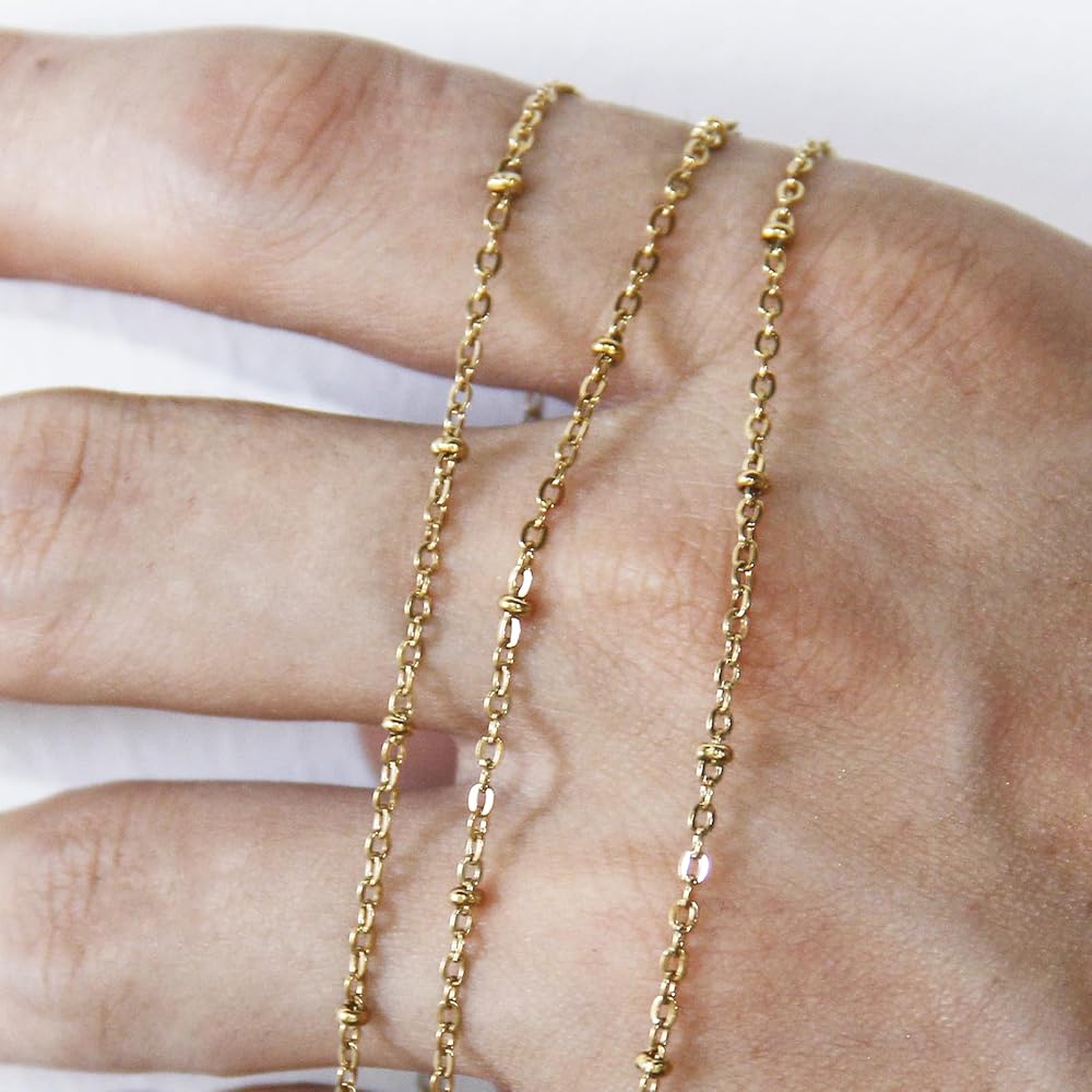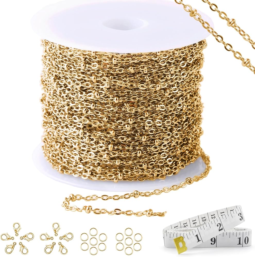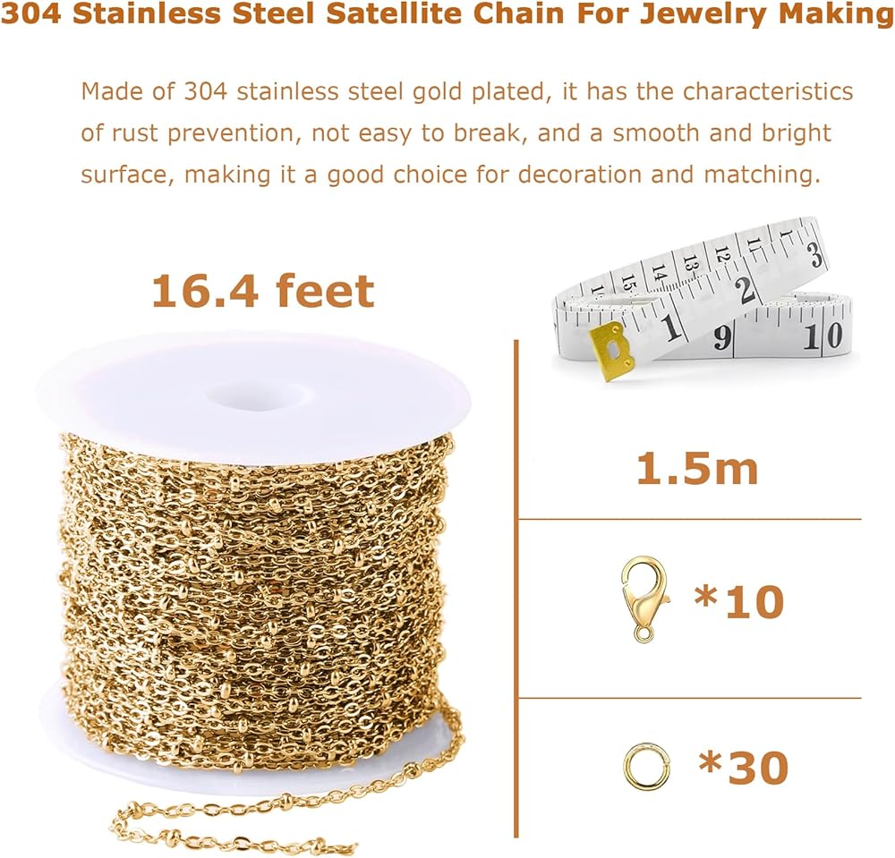 تحتوي المنتجات على: 16.4 قدم (5 متر) سلاسل من الفولاذ المقاوم للصدأ سلاسل ذهبية مزودة بـ 30 قطعة من حلقات القفز و10 قطع من مشابك جراد البحر و1 قطعة شريط قياس ناعم. يبلغ حجم سلاسل الوصلات حوالي 6.5 مم وعرض 2.5 مم. سهلة الصنع مثل قلادة للرجال ,قلادة من الفولاذ المقاوم للصدأ للنساء وغيرها من الملحقات.