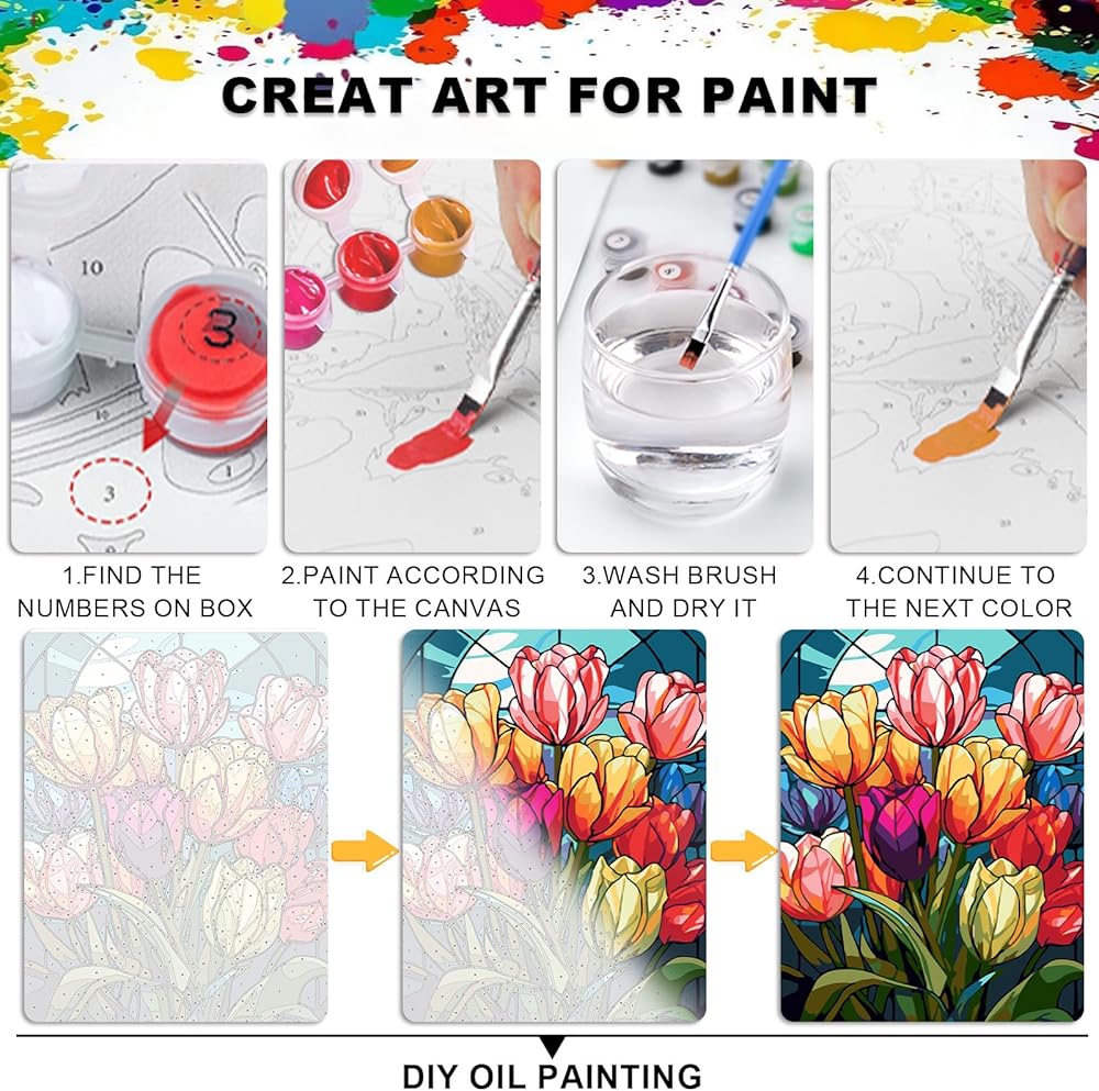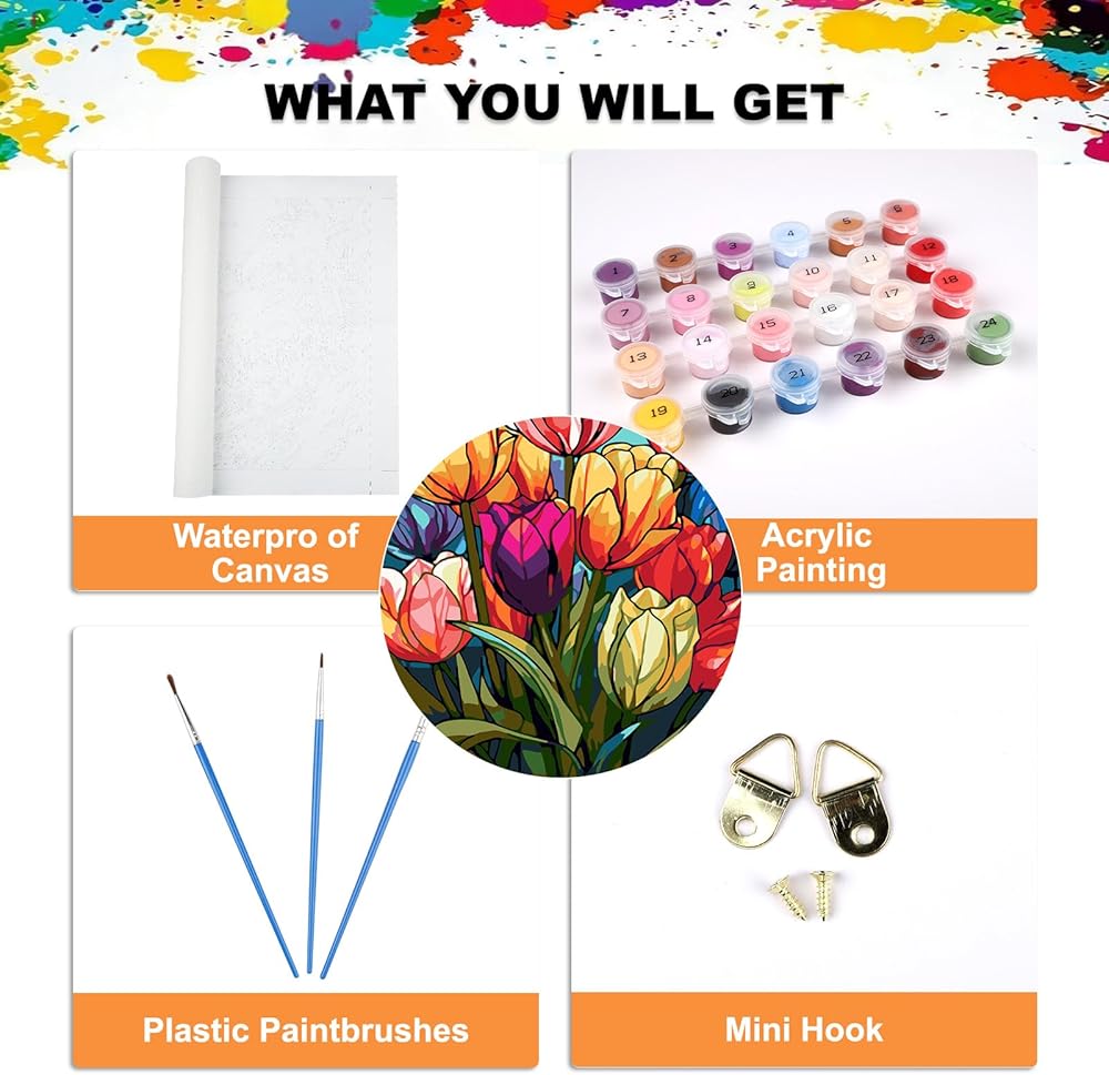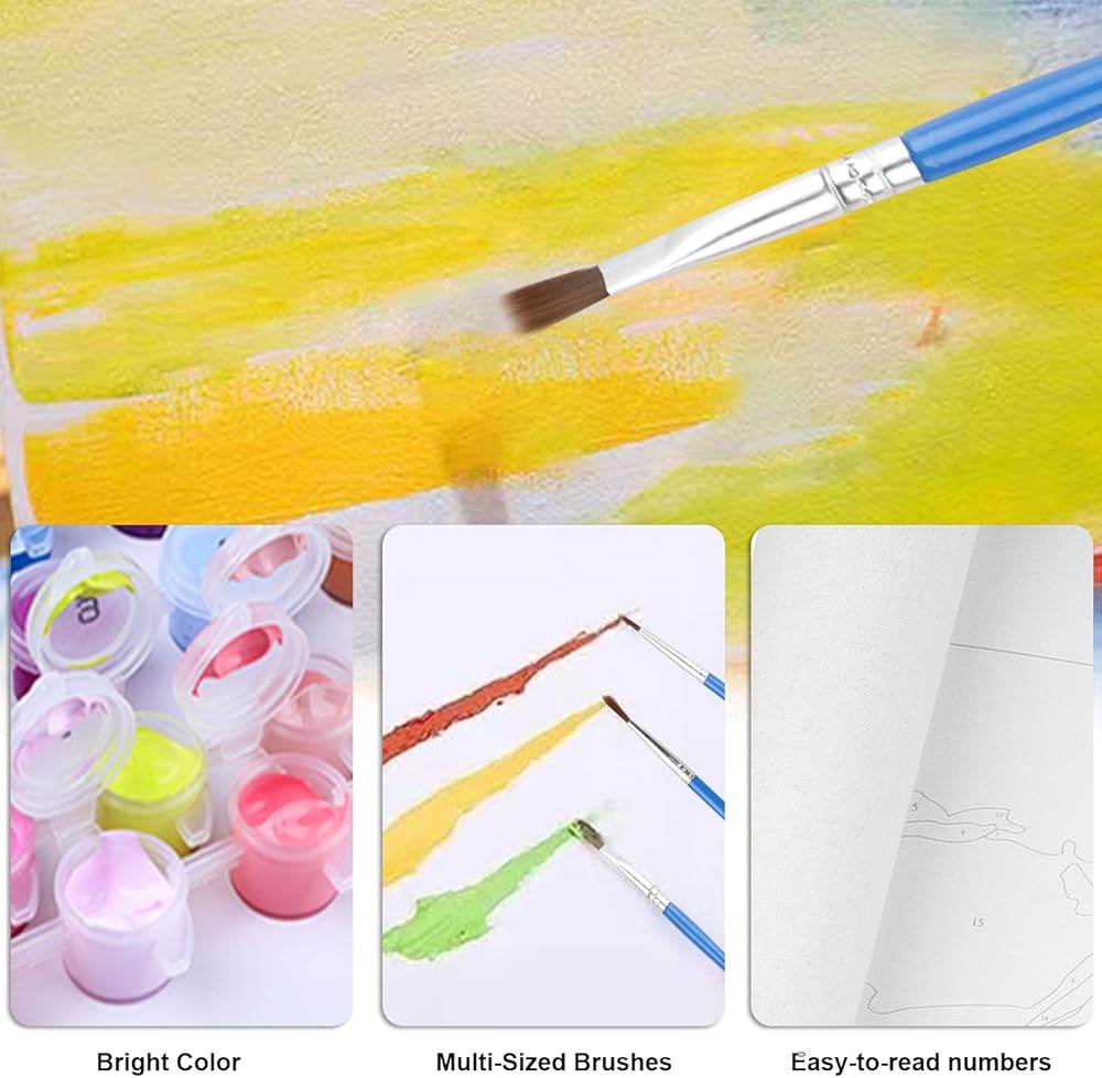 ستحصل على - يتضمن الطلاء بالرقم لوحة قماشية مقاس 16 × 20 بوصة/40 × 50 سم (بدون حدود)، و3 فرش، ومجموعة تثبيت على الحائط ومجموعة من الطلاء عالي الجودة.