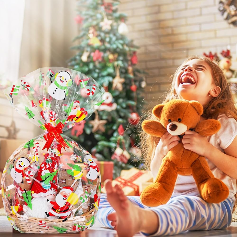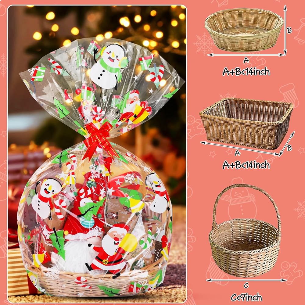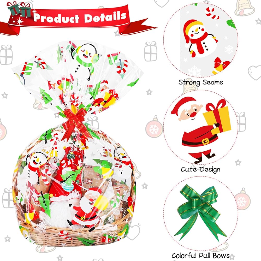 10 قطع من أكياس سلة السيلوفان لعيد الميلاد من ستيفورد، أكياس تغليف كبيرة لعيد الميلاد مقاس 60.96 × 35 بوصة لسلال الهدايا، سانتا كلوز ثلج، غلاف شفاف من السيلوفان مع 10 قطع من أقواس السحب لهدايا الحفلات الجيدة