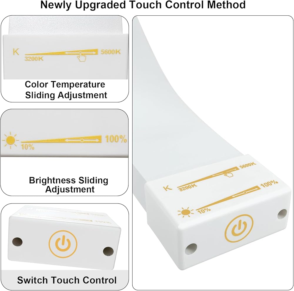 【سطوع قابل للتعديل ودرجة حرارة اللون 】 إصدار زر اللمس المنزلق يتميز بسطوع قابل للتعديل ودرجة حرارة اللون، درجة حرارة لون باردة ودافئة 3200 كلفن إلى 5600 كلفن، وتعديل السطوع من 0 إلى 100 بالمائة.