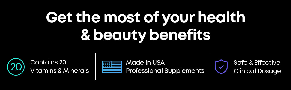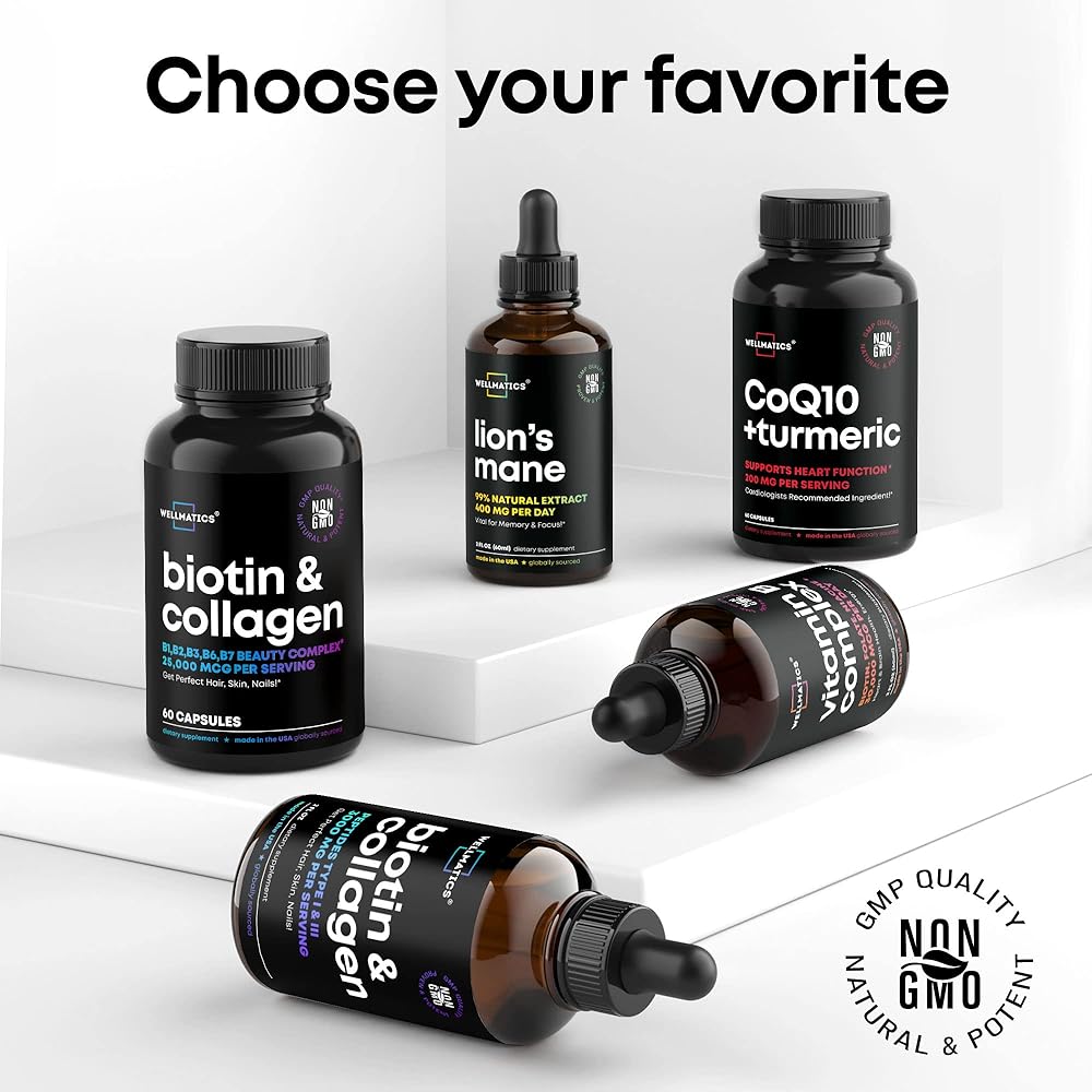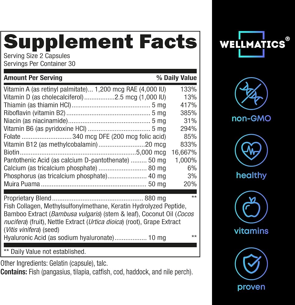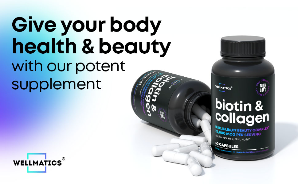 فيتامينات البشرة والأظافر والشعر - تعمل كبسولات البيوتين مع الكيراتين والكولاجين من ويلماتيكس على تحسين الصحة العامة من خلال تعزيز الأنسجة بمكعبات البناء الحيوية. تساعد حبوب البيوتين لدينا في منع تساقط الشعر وتحسين مظهره. يعزز الكولاجين المتعدد الموجود في مكمل التجميل لدينا البشرة المتوهجة والأظافر الصحية. قد يساعد في دعم صحة الشعر والجلد والأظافر لدى الأفراد الذين يعانون من نقص البيوتين.