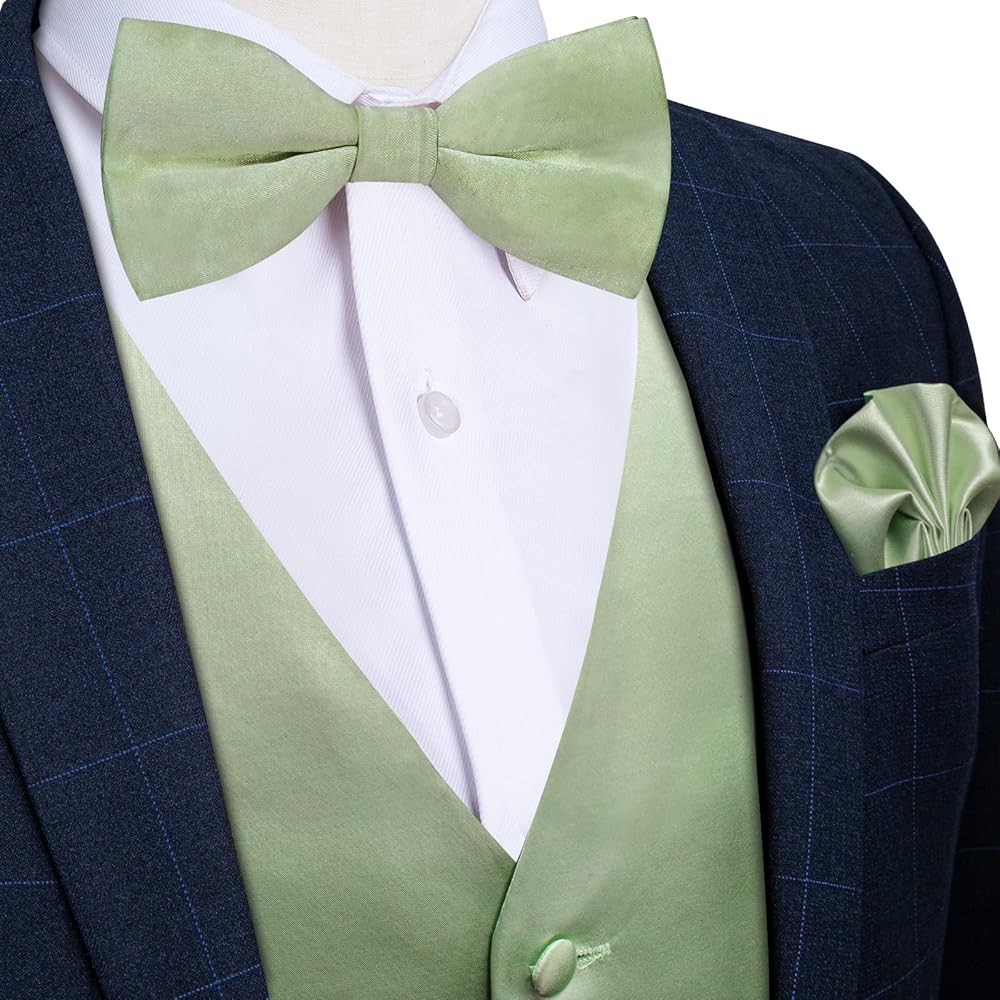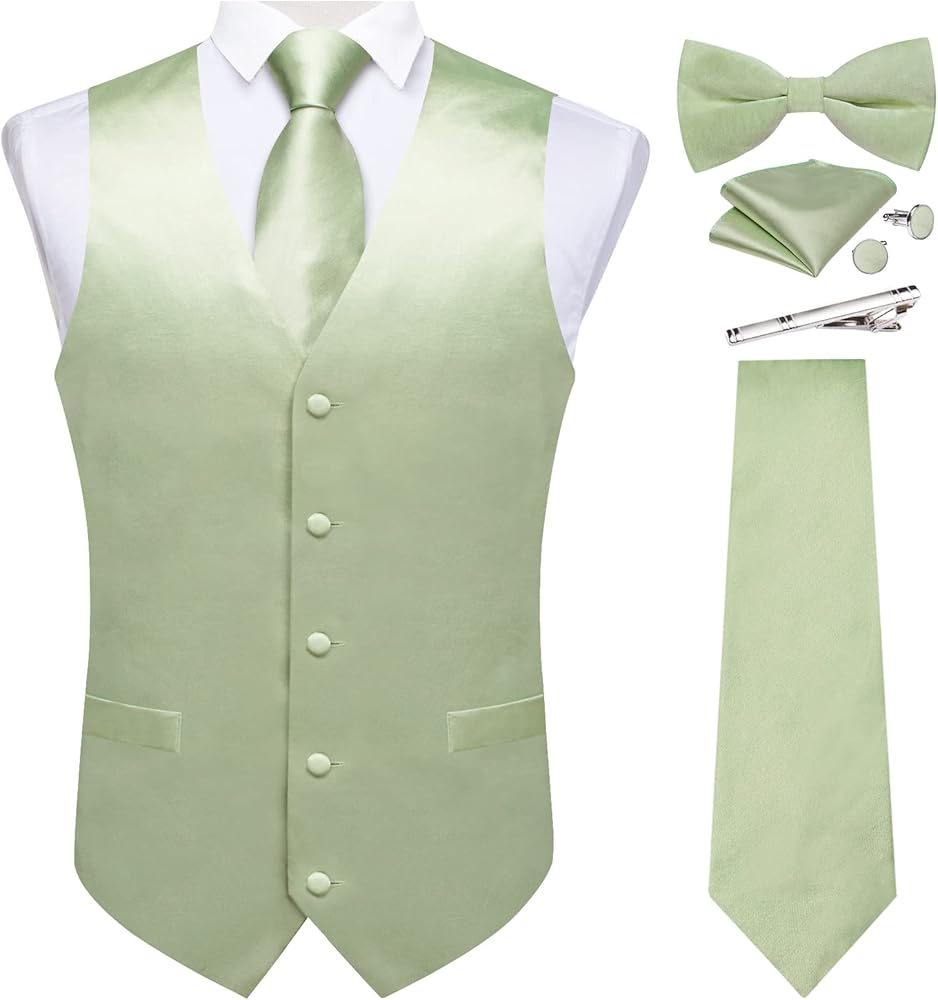 • مجموعة سترة مكونة من 6 قطع: مجموعة مكونة من 6 قطع من السترة الخضراء تتضمن صدرية، وربطة عنق، وربطة عنق، ومشبك، ومنديل جيب، وأزرار أكمام. المجموعة الكاملة من الصدرية لها نفس نمط اللون والنسيج، والتي يمكن مطابقتها مع البدلات والبدلات الرسمية والقمصان والسترات الصوفية وآخرون