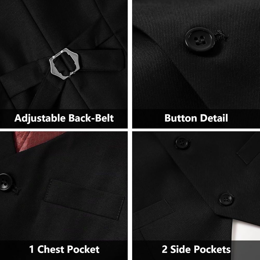 • Package: This 4-piece suit vest set includes a vest, a matching bow tie, a necktie, and a pocket square