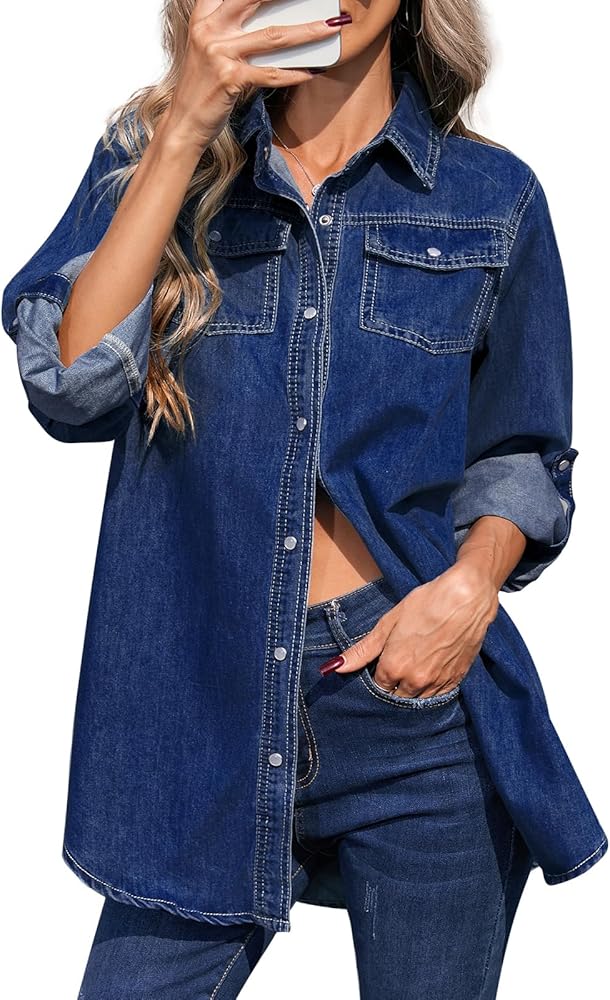 قميص نسائي من الدنيم الغربي بياقة أساسية، وأزرار لأعلى وجيبين مجوفين في الأمام، فضفاض ومريح، وحاشية سفلية بتصميم مهدب أنيق، وأكمام طويلة يمكن إسقاطها بسهولة ولفها لأعلى. قمصان ذات مقاس مريح. قميص كاجوال بأزرار سفلية للنساء. قمصان طويلة الأكمام للنساء. قمصان تونيك طويلة الأكمام. قمصان جينز للنساء كم طويل.