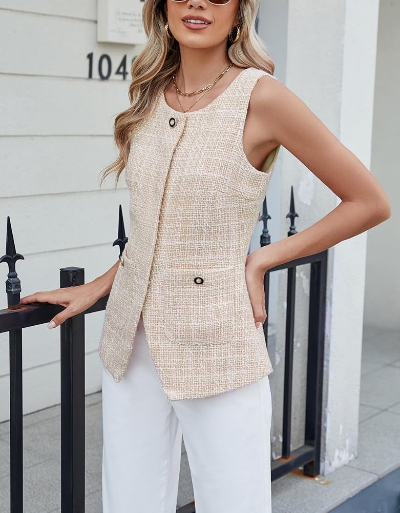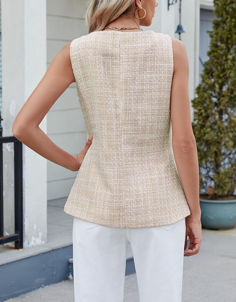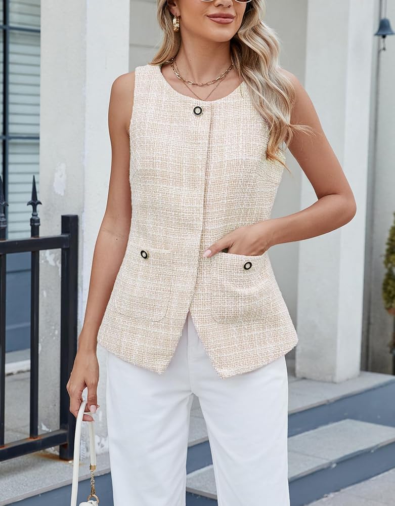 نمط جديد: سترات بليزر من التويد للنساء، سترة بليزر بدون أكمام، صدرية للنساء، سترة بدلة للنساء، سترات ملابس خارجية للسيدات، سترة مكتب عمل أنيقة ضيقة، سترة صدرية منقوشة من التويد، سترة بليزر من التويد