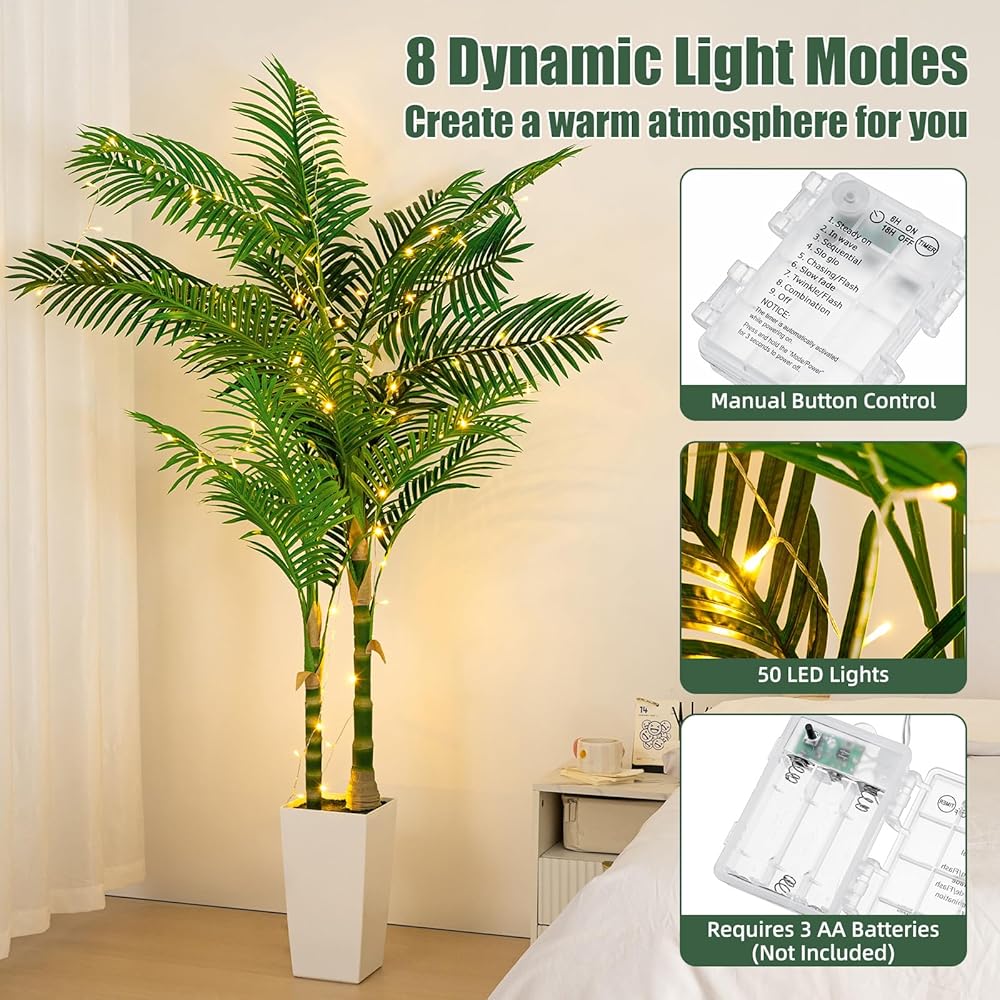 أضواء LED خرافية ساحرة: تأتي شجرة نخيل القصب الذهبية الاصطناعية بطول 6 أقدام (72 بوصة) مع سلسلة إضاءة LED خرافية يمكنك لفها بسهولة حول الشجرة لمزيد من الأجواء. مثالية لإضاءة أي غرفة، حيث تخلق الأضواء جوًا مريحًا للتجمعات أو الاسترخاء. [ملاحظة: تتطلب 3 بطاريات AA (غير متضمنة)]