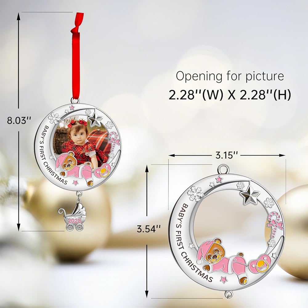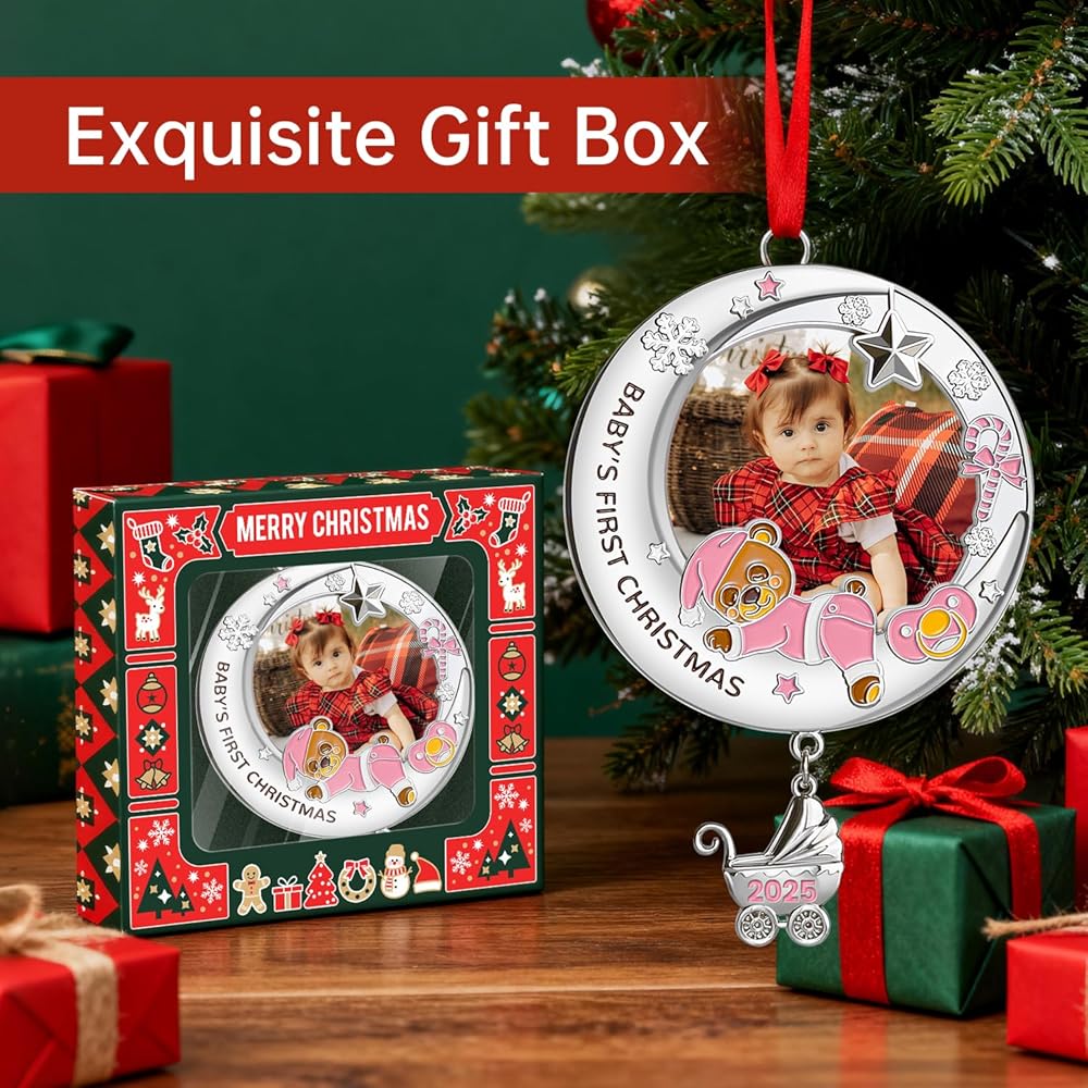 تذكار شخصي للصور: اعرض لحظة عزيزة عن طريق إدراج صورة! تحمل هذه الزينة صورة بمقاس 2.28 سم × 2.28 سم، مما يجعلها الطريقة المثالية لعرض ذكريات طفلتك الثمينة. إنها إضافة مبهجة لشجرة عيد الميلاد الخاصة بك وتذكير خالد بعيد الميلاد الأول لها.