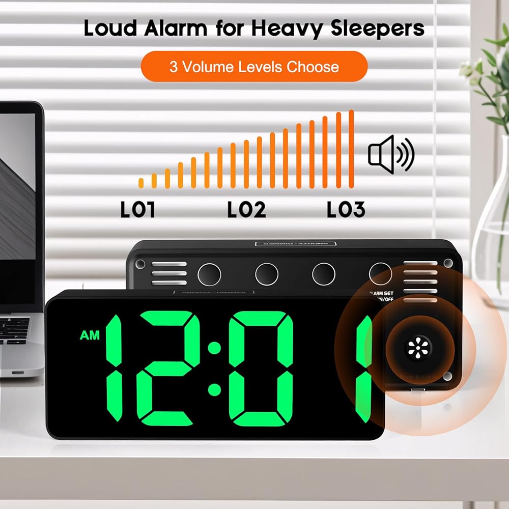 ساعة منبه صوتية مع التحكم في مستوى الصوت: 3 إعدادات للتحكم في مستوى الصوت للمنبه تمكن الساعة من أن تكون عالية جدًا للبالغين الذين ينامون كثيرًا والمراهقين والأطفال أو أولئك الذين لديهم صعوبة في الاستيقاظ. كما يسمح لك أيضًا بضبط المنبه على مستوى صوت أقل للمساعدة في حماية سمعك أثناء إيقاظك.