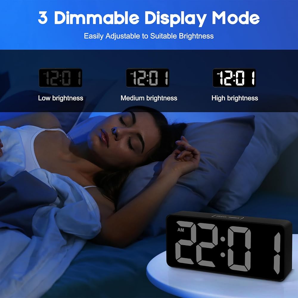 ساعة منبه قابلة لتعديل الإضاءة مع 3 أدوات خافتة للضوء: باعتبارها ساعة منبه حديثة لغرف النوم، تحتوي ساعة السطوع هذه على 3 مستويات خافتة قابلة للتعديل لتلبية الاحتياجات المختلفة للسطوع. مستوى السطوع لا يلهيك عن النوم، مما يضمن لك رؤية الوقت بوضوح عبر الغرفة والتحقق بسهولة من الوقت ليلاً بعدده الكبير. والأهم من ذلك، أن هذه الساعة الإلكترونية يمكنها حماية بصرك من الأذى من خلال أداة التعتيم القابلة للتعديل.