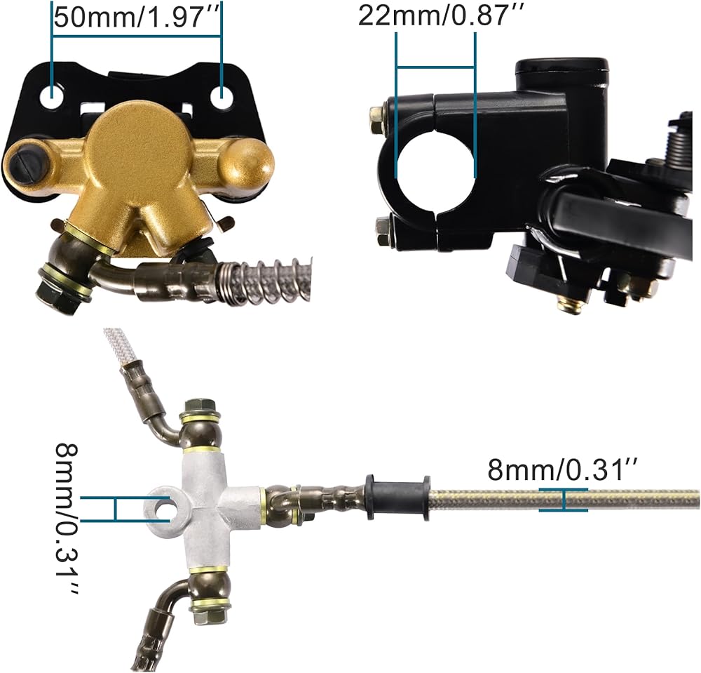 - مجموعة فرامل القرص الأمامي، قطر فتحة التثبيت: 22 مم (7/8 بوصة). طول الأنبوب الرئيسي: 650 مم/25.6 بوصة؛ طول الأنبوب الفرعي: 450 مم/17.72 بوصة