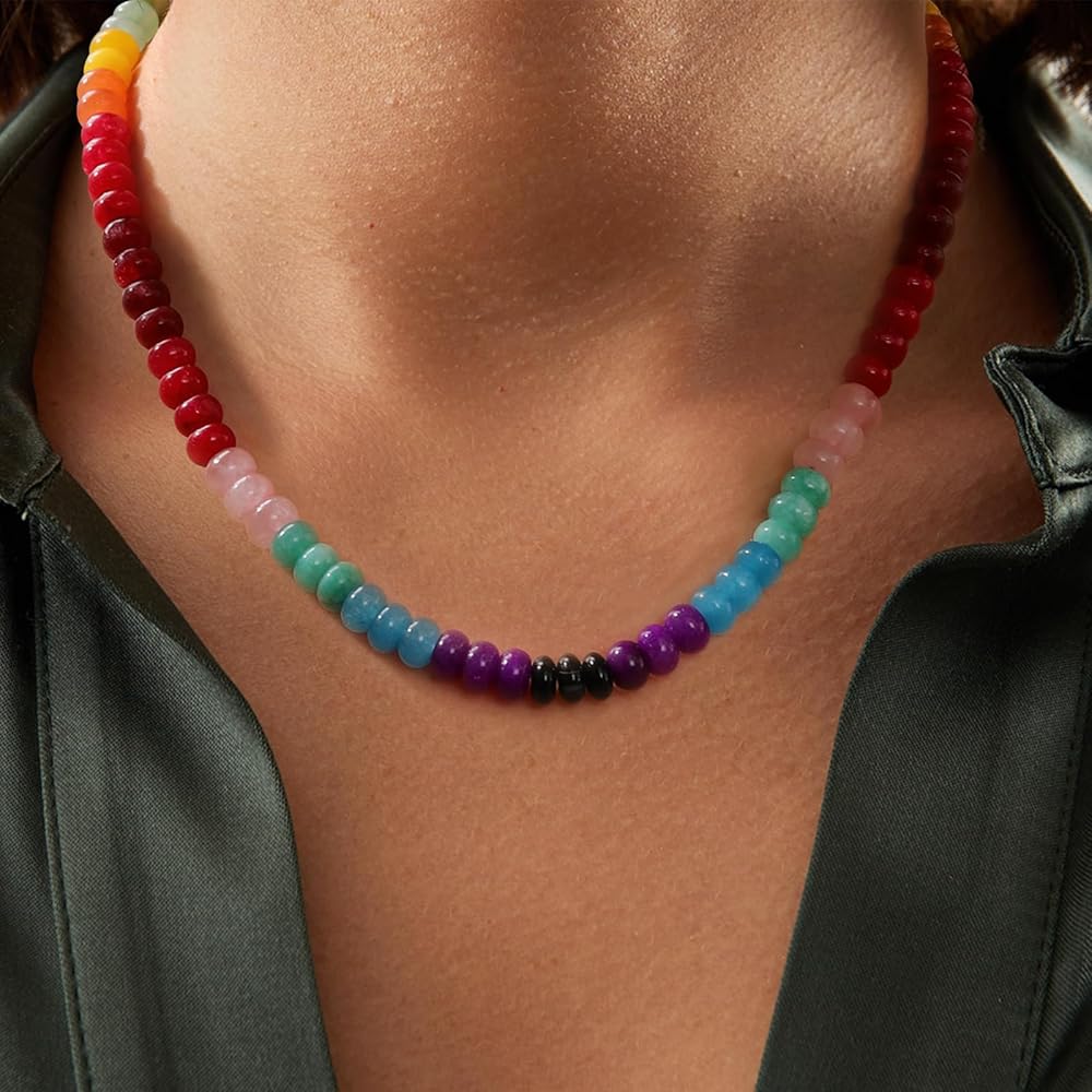تصميم متدرج بألوان قوس قزح عصري: تتميز هذه القلادة بتدرج مذهل لقوس قزح، وتمزج بين ألوان الباستيل الناعمة مثل الوردي والأزرق مع درجات أعمق مثل الأرجواني والأحمر. أسلوبها النابض بالحياة والفريد من نوعه مثالي لإضافة لمسة من الألوان إلى أي ملابس سواء كنت ترتدي ملابس مناسبة لمناسبة خاصة أو تبقيها غير رسمية.