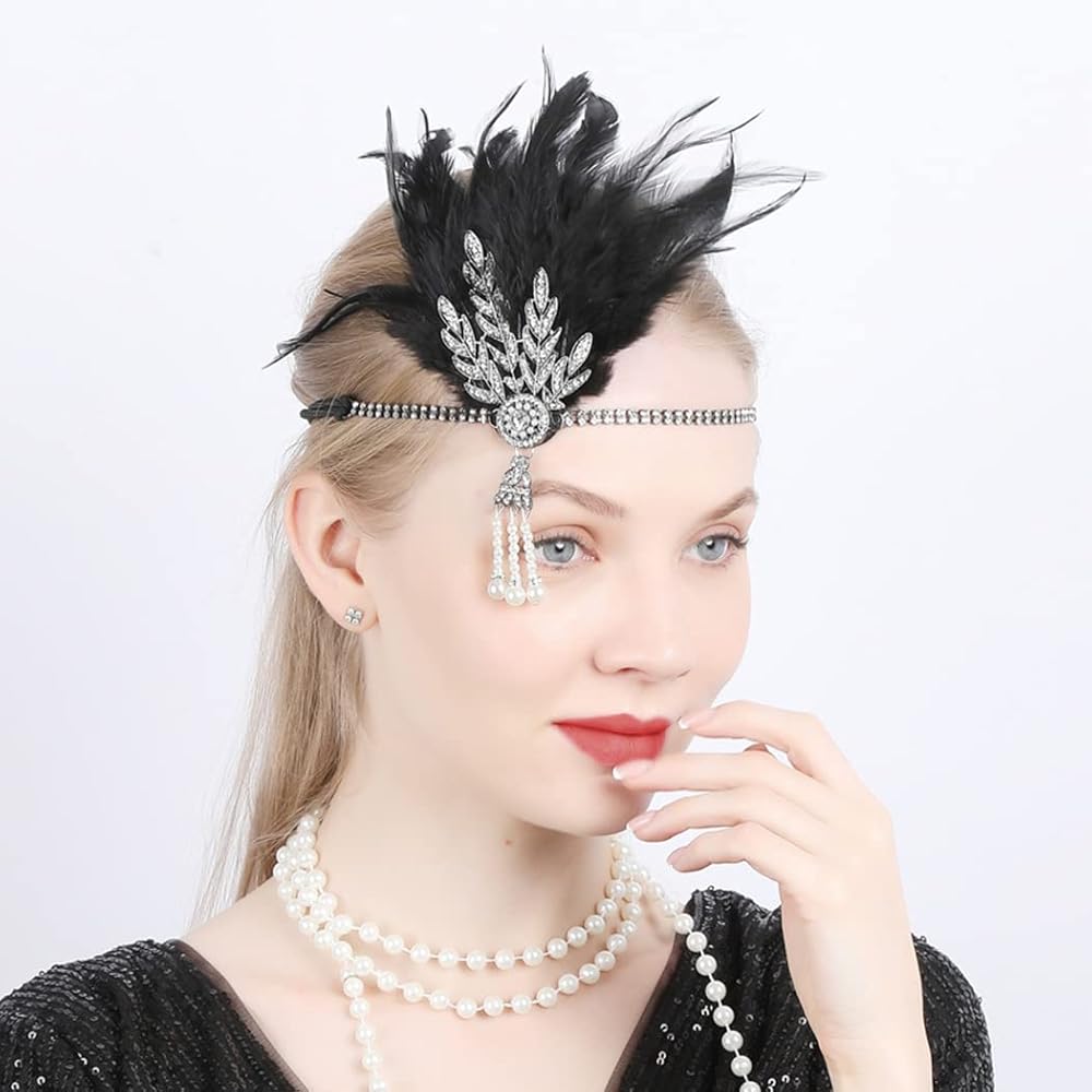 • ريشة عصابة الرأس على طراز آرت ديكو من عشرينيات القرن العشرين: ريش رقيق يتناقض مع تصميم الأوراق الكلاسيكية وشرابات اللؤلؤ؛ شريط أمامي مزين بالكريستال. تتأرجح شرابات اللؤلؤ بلطف مع الوتيرة، والماس المتلألئ يجذب الجمهور، مما يجعلك الشخص اللافت للنظر في الحفل.