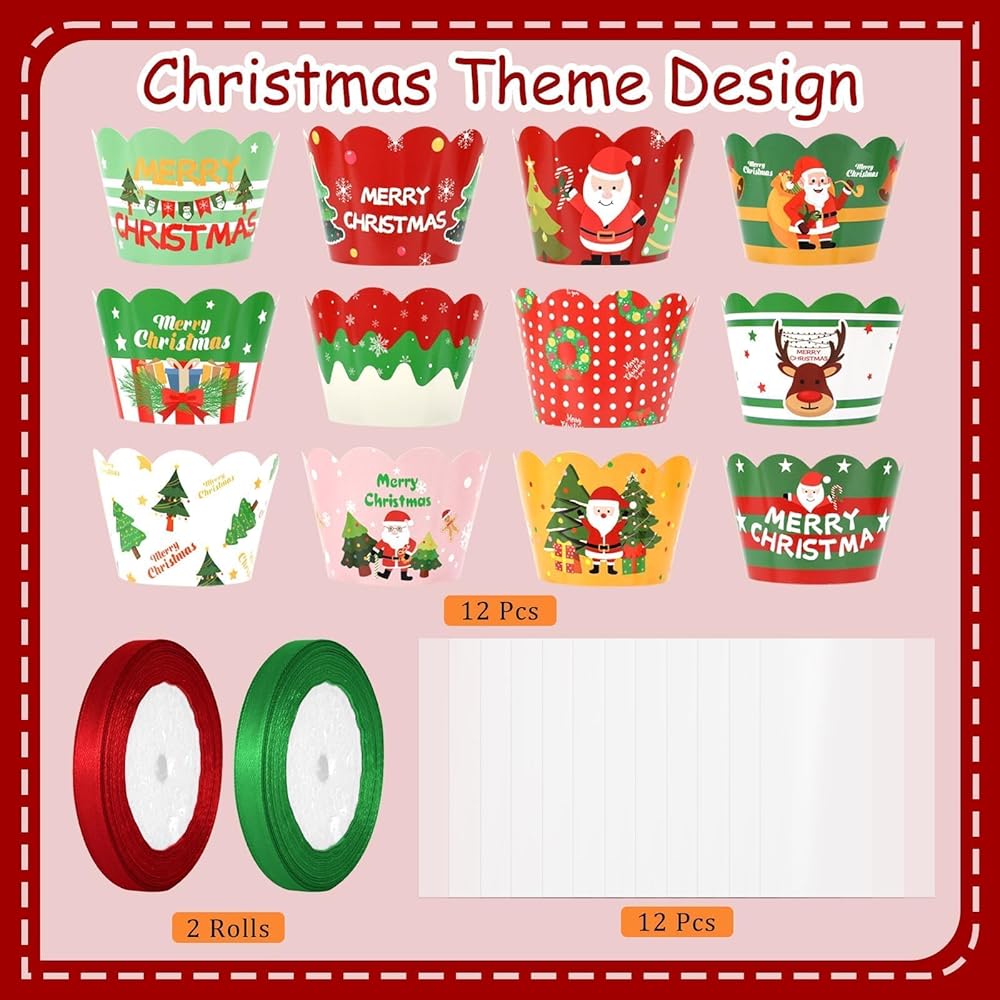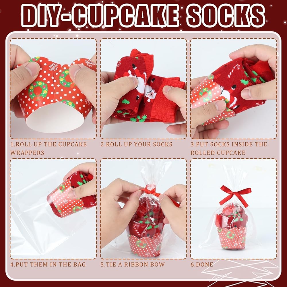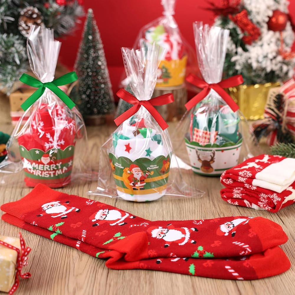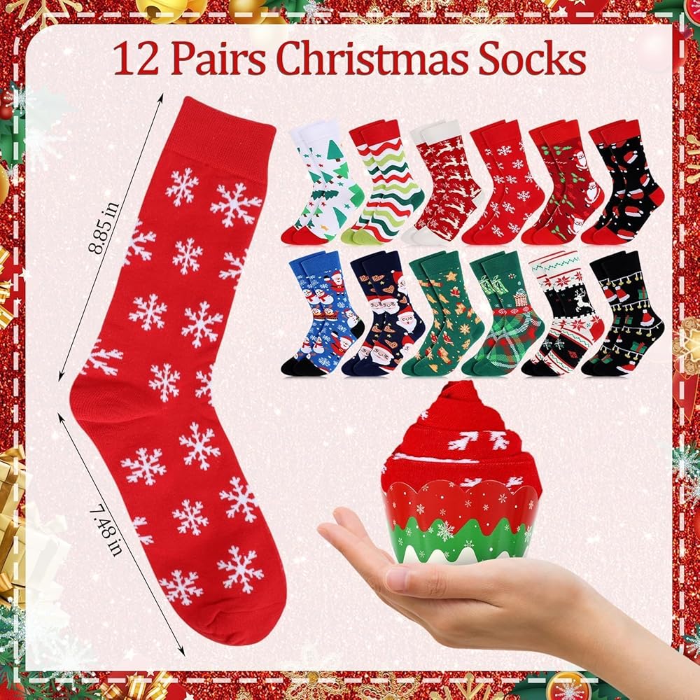الكثير من المخزون البديل: سوف تحصل على 12 زوجًا من جوارب عيد الميلاد في 12 نمطًا لطيفًا مختلفًا للحصول على ملاءمة مثالية، و12 لفافة كب كيك في 12 نمطًا، و12 كيسًا و2 لفافة من الشريط الأحمر والأخضر. كافية لاحتياجاتك اليومية للارتداء والاستبدال، يمكنك إعطاء هذه الجوارب المزخرفة الرائعة لأصدقائك، منتجنا غير مجمع.