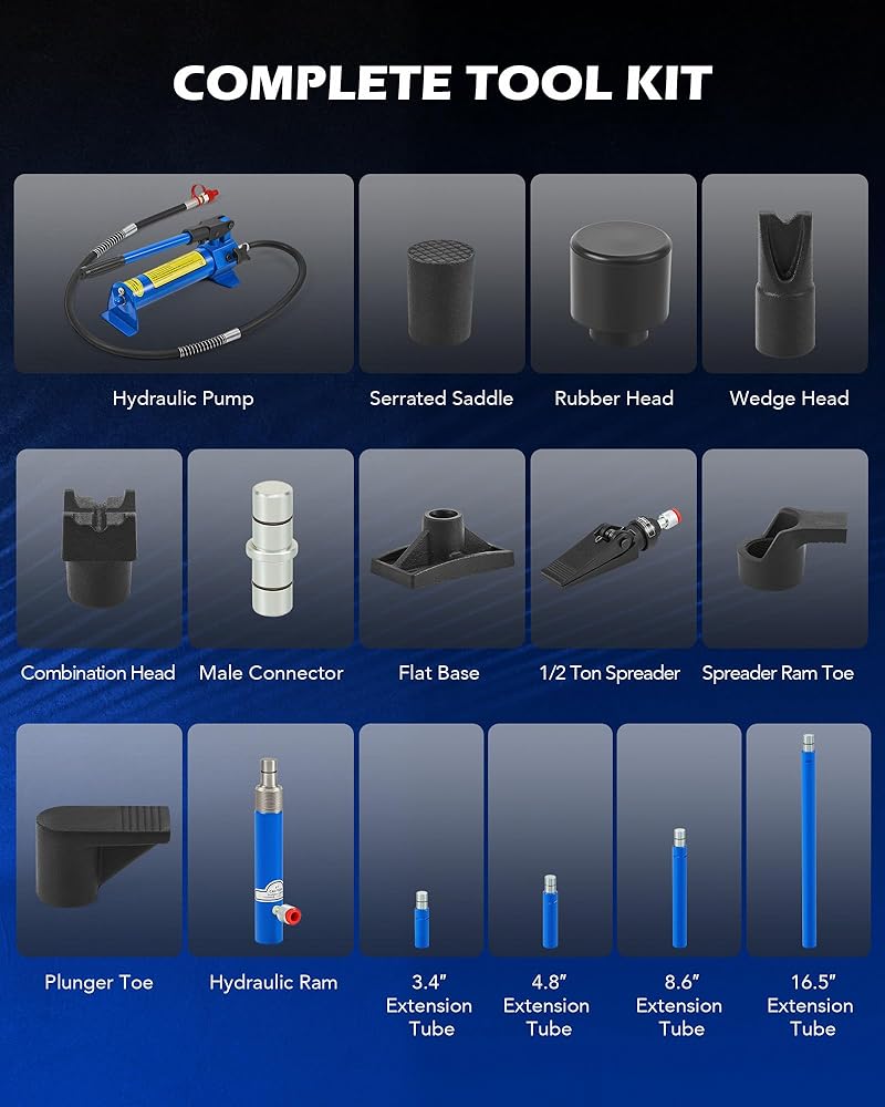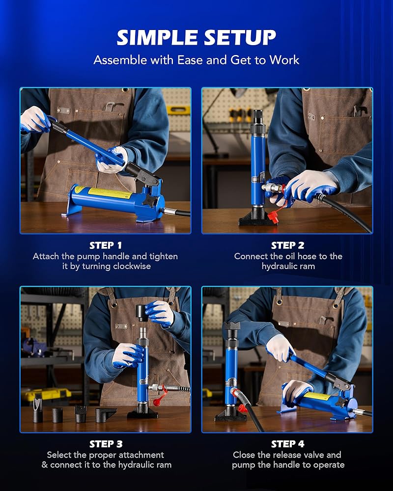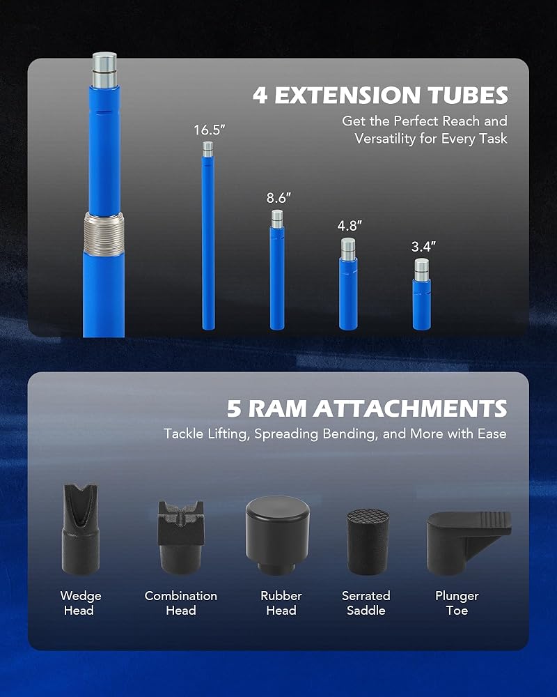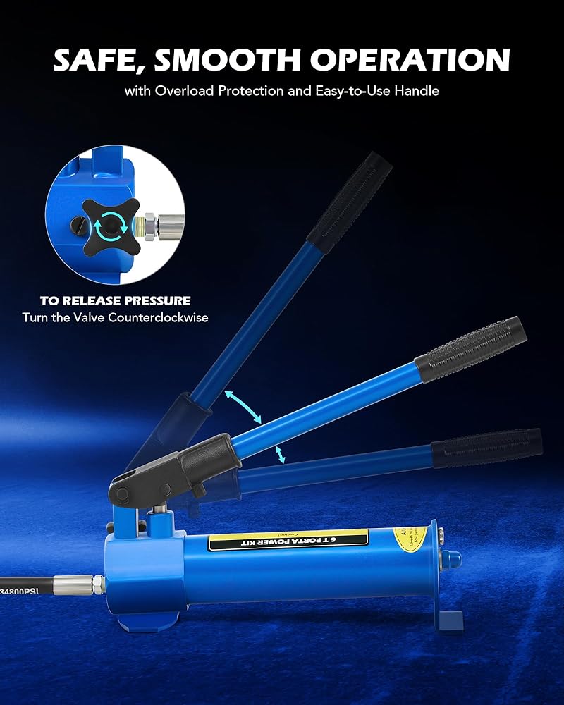 سهولة الإعداد والتشغيل: تتميز أنابيب التمديد هذه بتصميم قفل سريع للتجميع السريع. تأتي المضخة الهيدروليكية مزودة بخرطوم زيت بطول 4.7 قدم لنقل السوائل بكفاءة، كما تعمل المقابض مقاس 12 بوصة على تقليل جهد الضخ، مما يجعل التشغيل أكثر سلاسة