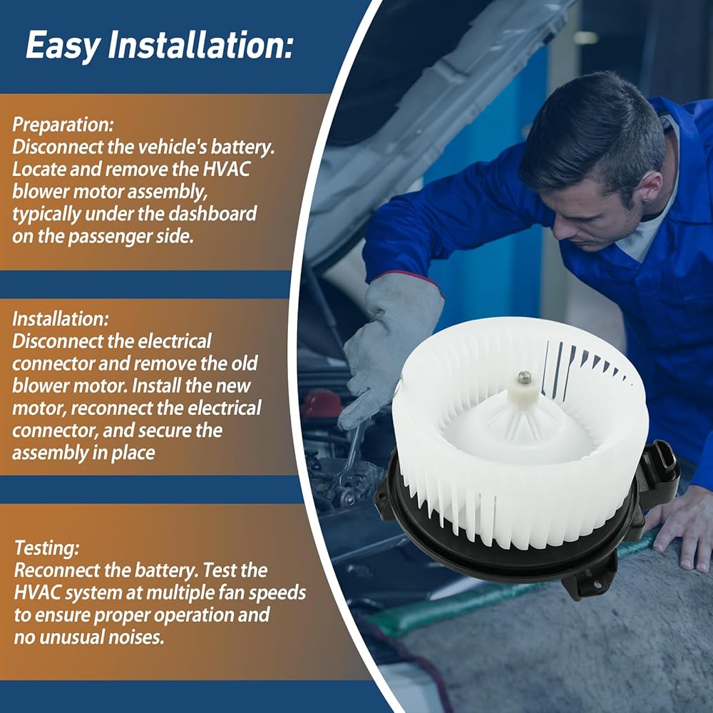 REPLACES PART NUMBERS: Compatible with 68232372AC, 87103-0E040, 87103-60400, 700215, PM9351, 75830. Installation is easy with no special tools required—simply remove a few screws under the passenger side dash, swap out the old blower motor, and install the new one. It's also recommended to replace your blower control relay/motor resistor for optimal performance.