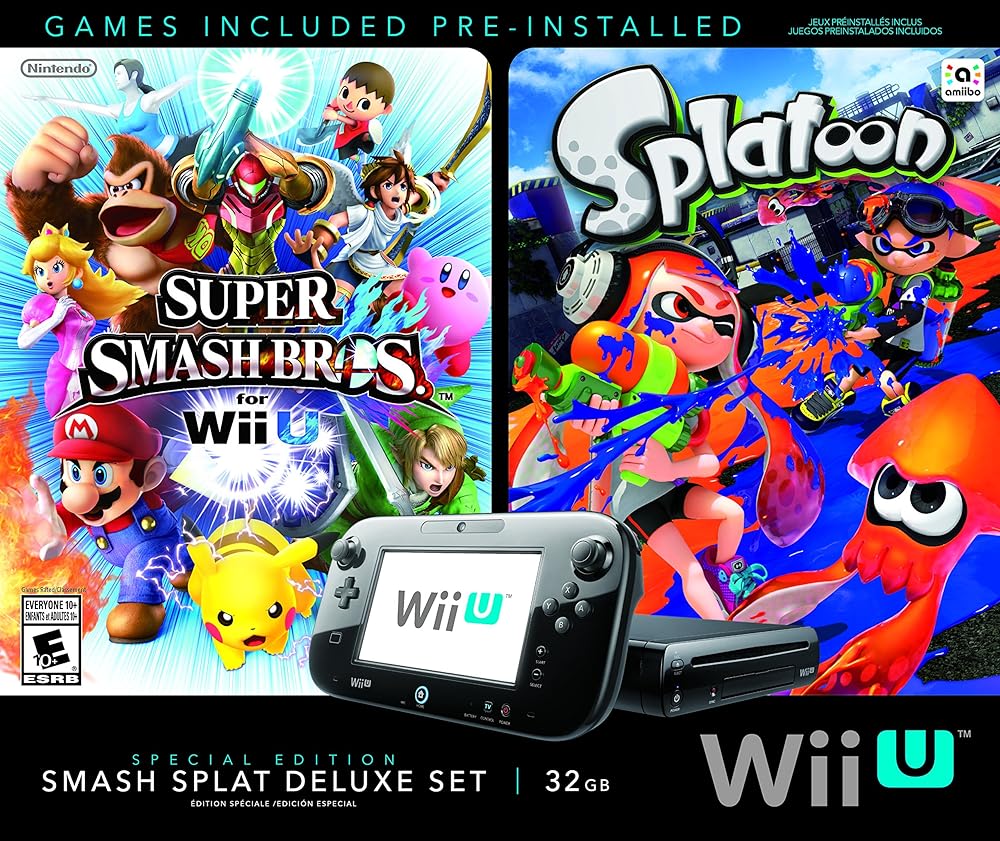 Includes a black Nintendo Wii U console, Super Smash Bros. and Splatoon games pre-installed, a GamePad controller, two AC adapters, HDMI cable, sensor bar, GamePad cradle, GamePad stand and and console stand