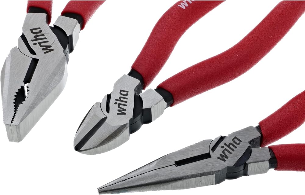 Wiha 32698 pliers and cutters three piece set. Three piece set includes combination pliers 7", long nose pliers 6.3" and diagonal cutter 6.3". Drop forged from special tool steel, individually high frequency induction hardened. Precision formed. Soft vinyl grips oil and solvent resistant.