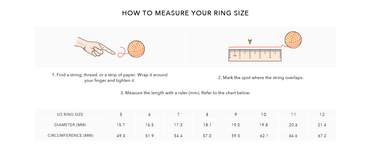 • ضماننا: يرجى الرجوع إلى جدول المقاسات الخاص بنا للعثور على مقاس الخاتم المثالي. نحن نقدم ضمان استرداد الأموال لمدة 30 يومًا دون طرح أي أسئلة.