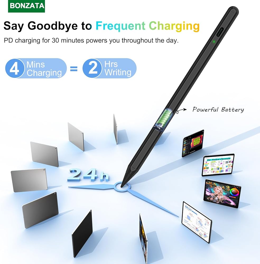 TYPE C CHARGING PORT & ULTRA LONG STANDBY - Fast Type-C charging in 5-30 minutes. Stylus for iPad pencil 10th generation can work for 10 hours straight with 365 days of persistent standby time, and stylus for iPad pencil 9th generation can be charged for about 5-30 minutes each time using USB C cable (contained) via an adapter, a mobile power supply, and computer.