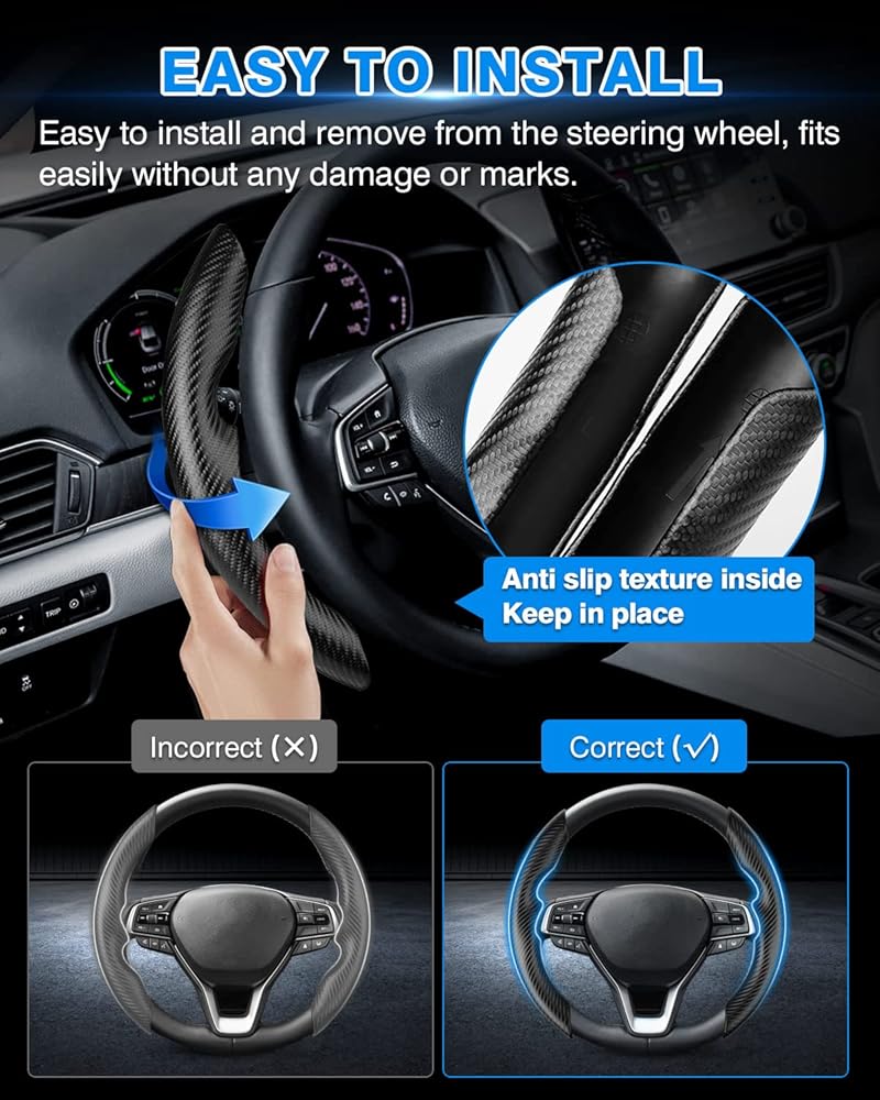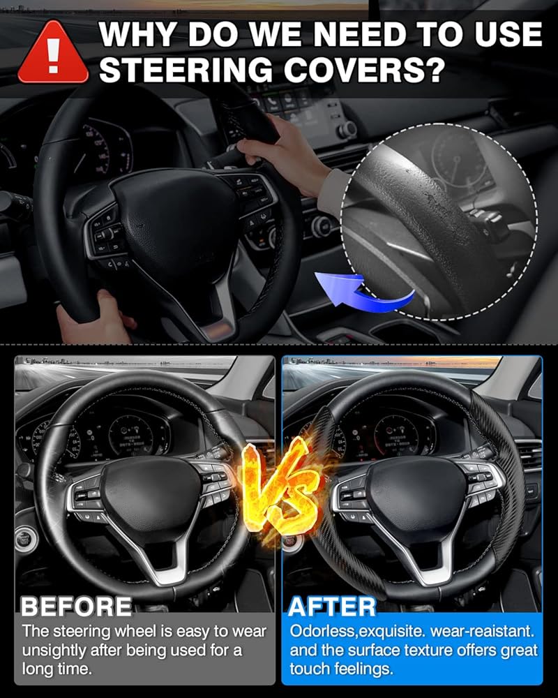 【Premium Steering Wheel Protector】:The Honda Accord steering wheel cover is made of safe and premium, soft,odorless carbon fiber PU leather, which boasts remarkable breathability that keeps palms cool and dry for a reliable non-slip grip. This steer wheel cover reduces hand slippage while also acting as a barrier from UV rays.
