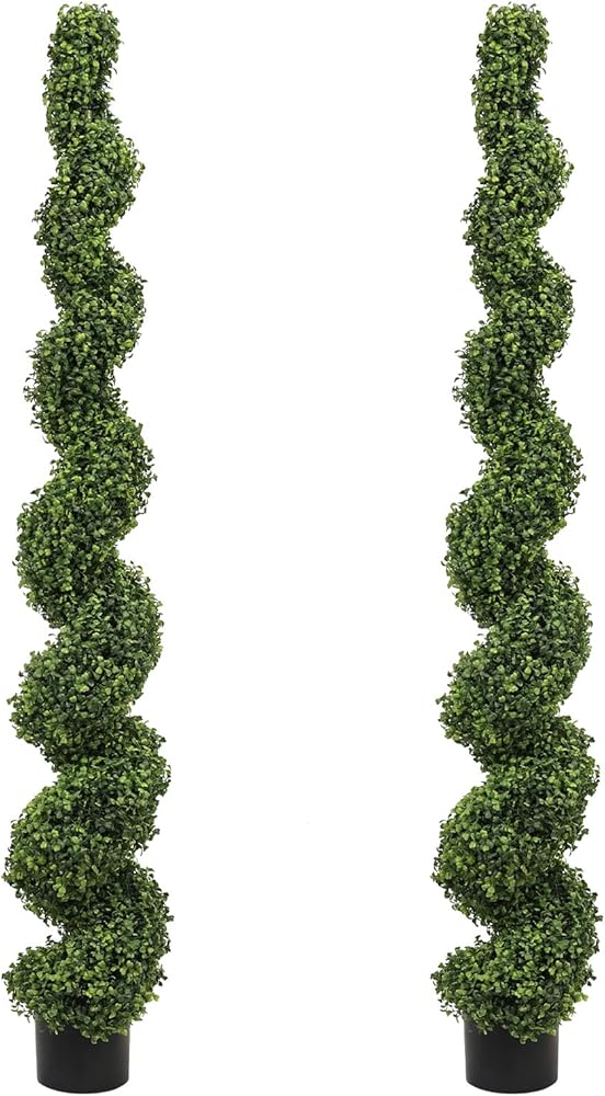 𝗦𝗲𝘁 𝗼𝗳 𝟮 𝗦𝗽𝗶𝗿𝗮𝗹 𝗔𝗿𝘁𝗶𝗳𝗶𝗰𝗶𝗮𝗹 𝗧𝗼𝗽𝗶𝗮𝗿𝘆 𝗧𝗿𝗲𝗲𝘀 - بطول 4 أقدام: عزز مساحتك الخارجية أو الداخلية مع هذه المجموعة المكونة من شجرتين توبياري اصطناعيتين في الهواء الطلق. مثالية لشرفتك الأمامية، أو فناء الحديقة، أو المرآب، أو بيت المزرعة، أو الباب الأمامي، أو المكتب، تضيف أشجار الأرز الحلزونية هذه التي يبلغ طولها 3 أقدام لمسة من الأناقة والرقي إلى أي مكان. مظهرها الواقعي يجعلها خيارًا متميزًا لأي شخص يبحث عن إضافة أشجار توبياري صناعية إلى ديكوره.