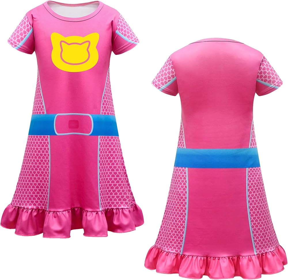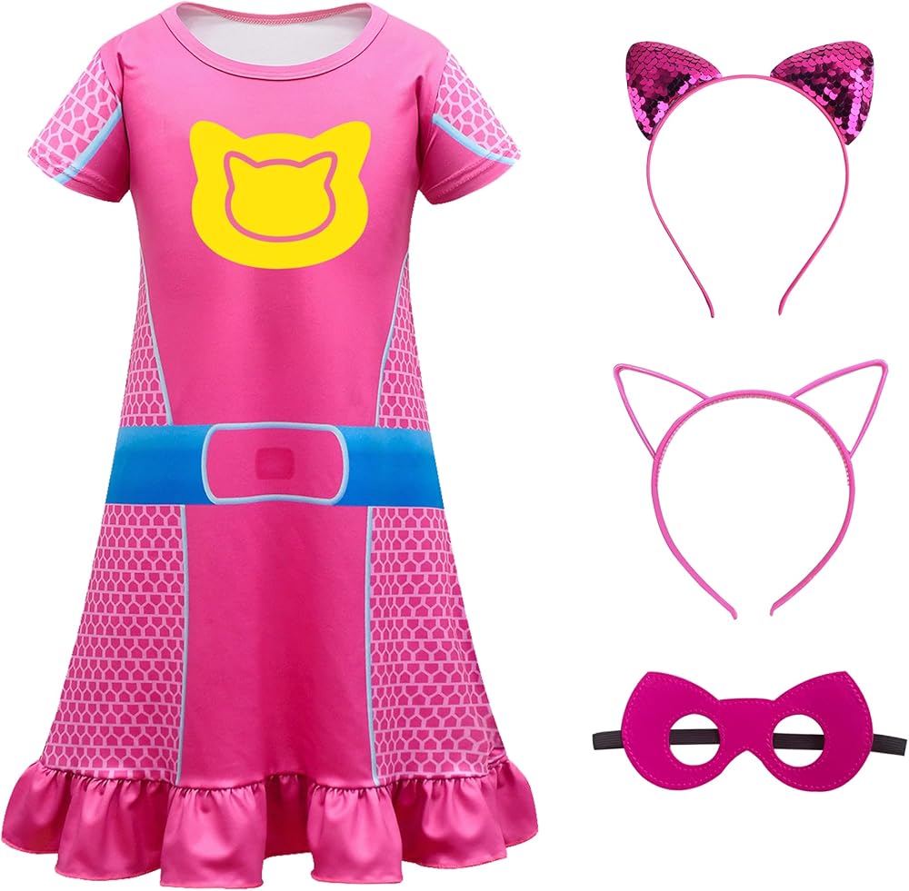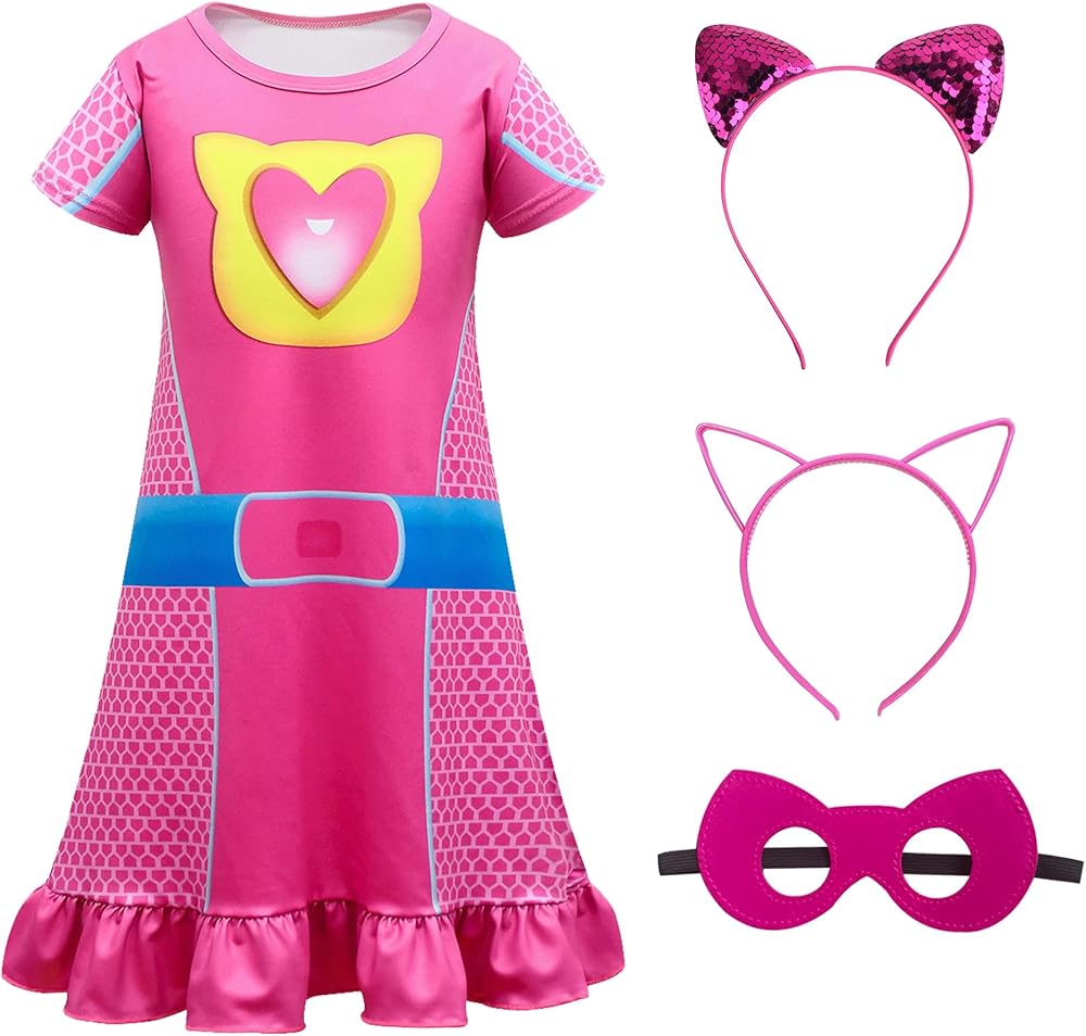 Innovative Design:Unleash your princess's imagination with this adorable and playful dress-up set! The centerpiece with a heart-shaped design, complemented by Short sleeve adorned with a heart pattern. It features a bright belt pattern that adds a pop of color and a ruffled hem for a touch of whimsy. But the fun doesn't stop there! This set also includes : a sequined cat ear headband, a hollow cat ear headband, and a mask with cat ears.