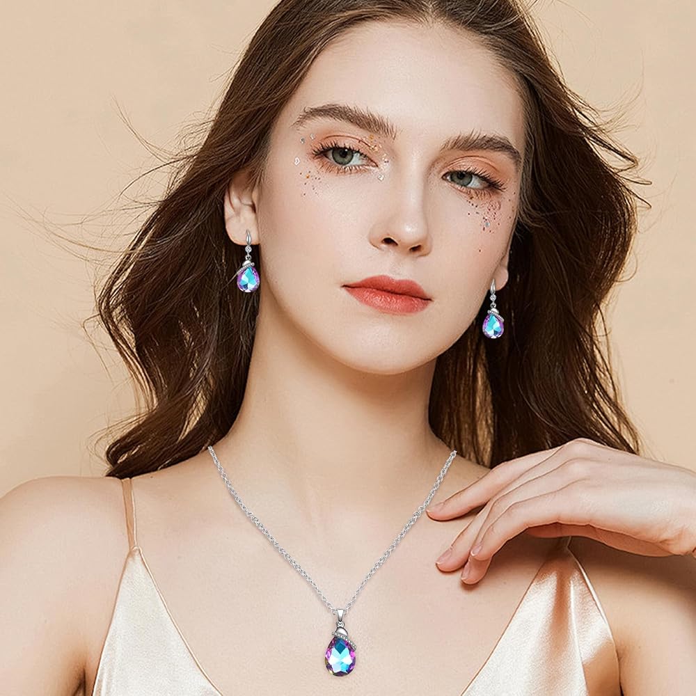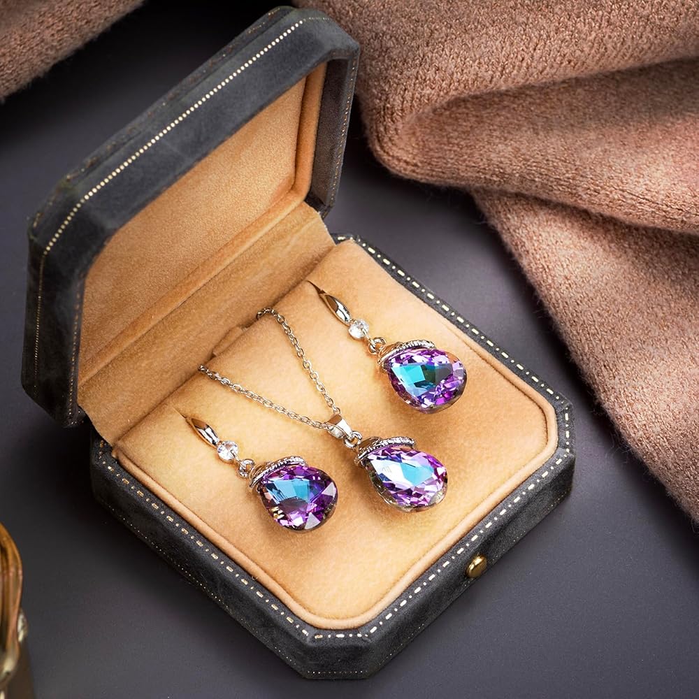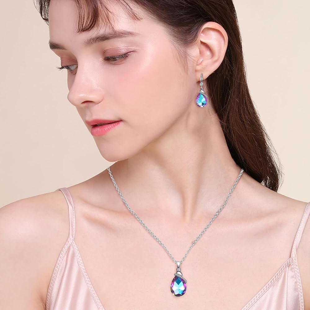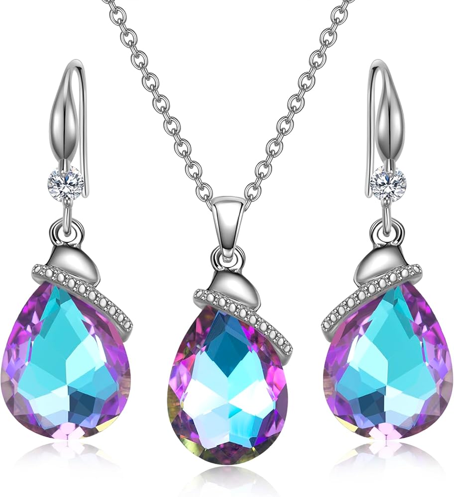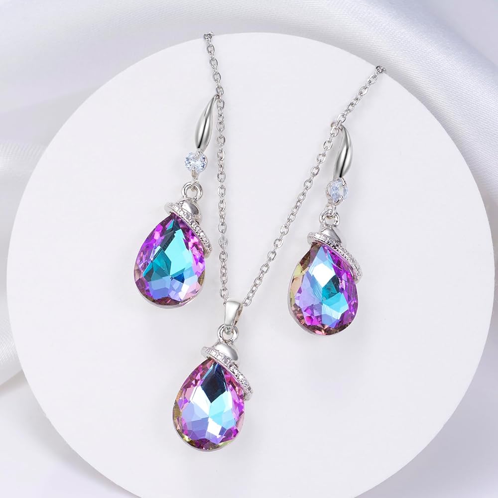 • هذه القلائد والأقراط الكريستالية على شكل دمعة عصرية وأنيقة. يتميز الجسم بشكل قطرة الماء/بيضاوي مع كريستال لامع وزخرفة زركونيا مكعبة، ولن يصبح قديمًا وسهل مطابقته. ألوان متعددة للاختيار من بينها، مثل البنفسجي والأرجواني الشفقي والأحمر والأزرق والمتعدد وما إلى ذلك. من المؤكد أن التصميم الأنيق والملفت للنظر سيجذب الكثير من الاهتمام ويساعدك على كسب المزيد من الثناء.