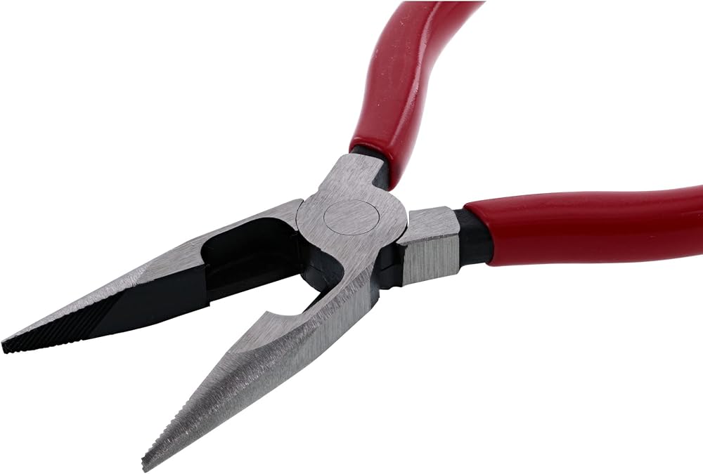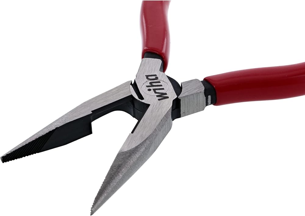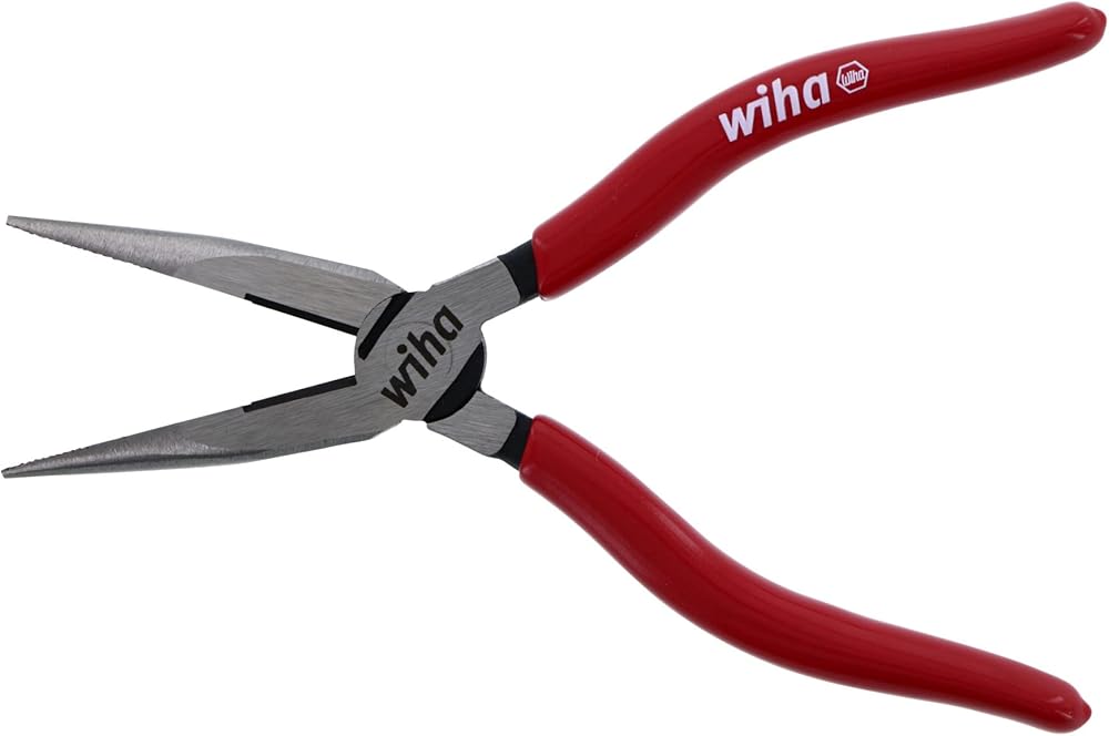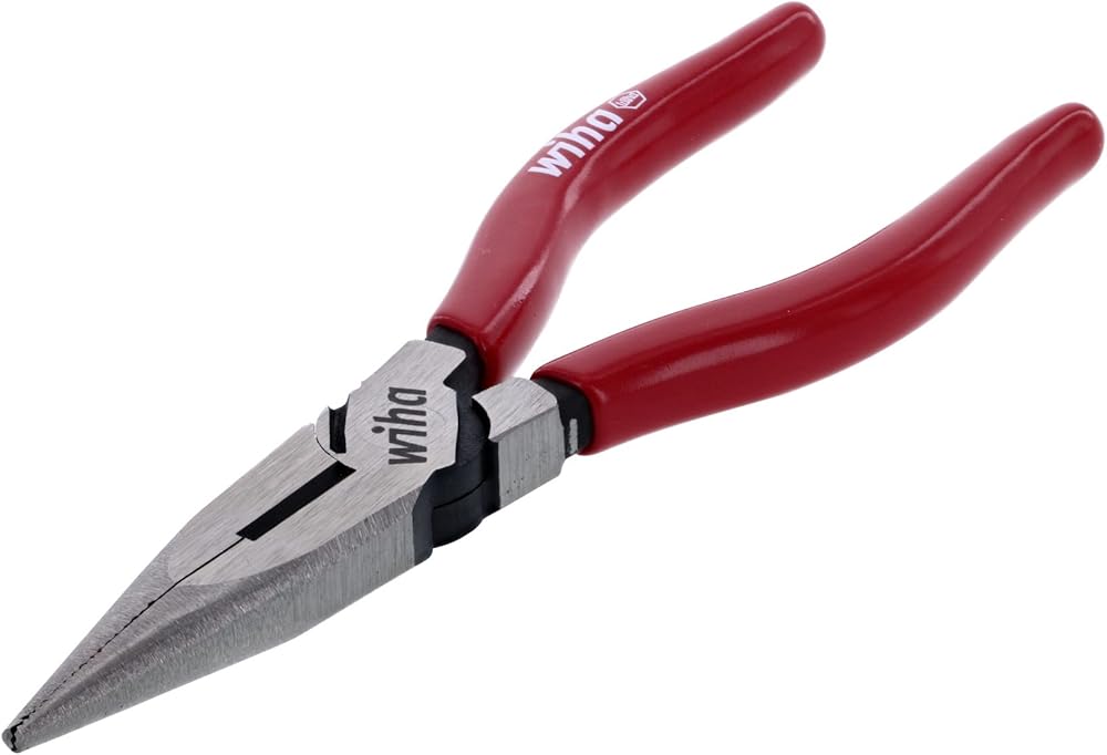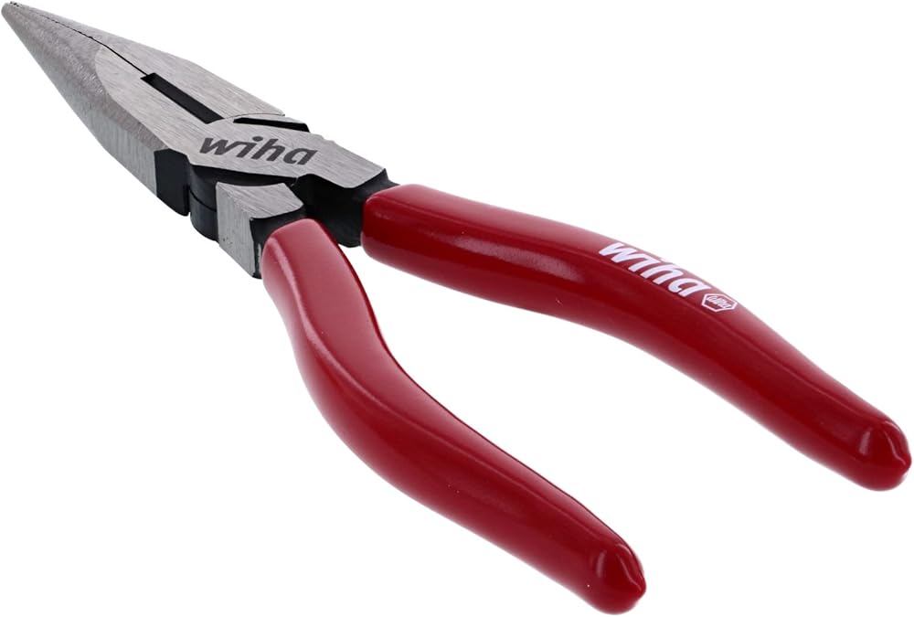 Wiha 32618 long nose pliers with cutters, 6.3-inch OAL. Cutting capacity cooper AWG #10, DIN ISO 5745 extra long cutters for flat and round cables. Serrated jaws. Cutting edges additionally induction hardened to approximately 60 HRC. Special CV tool steel forgings. Soft vinyl gripps, oil and solvent resistant.