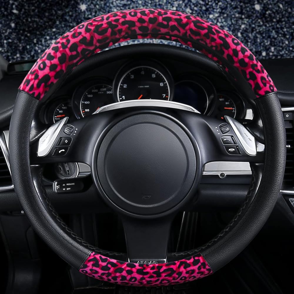 غطاء عجلة قيادة السيارة من جلد الفهد من دوتسي ناعم ومضاد للانزلاق وجيد التهوية من القطيفة لحماية عجلة القيادة للنساء والرجال مقاس 15 بوصة (وردي)