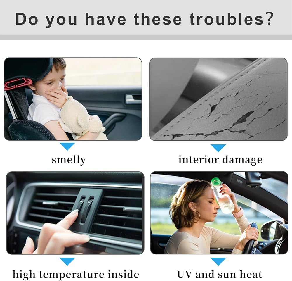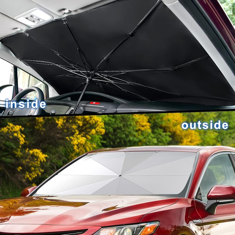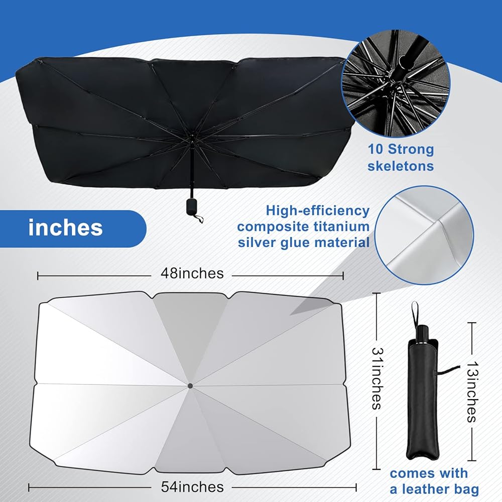 【Make Sure Your Vehicle Is Ready For Hot Summer Days】While a car is parked, heat and UV rays combine to put a beating on interior components. Dashboards and leather upholstery become dry and discolored. The Motomate windshield sun shade protects your interior from harmful UV rays. Its clever design significantly reduces interior temperatures by as much as 80 degrees Fahrenheit.