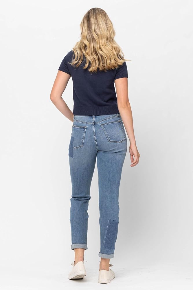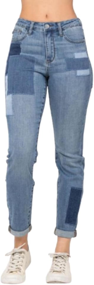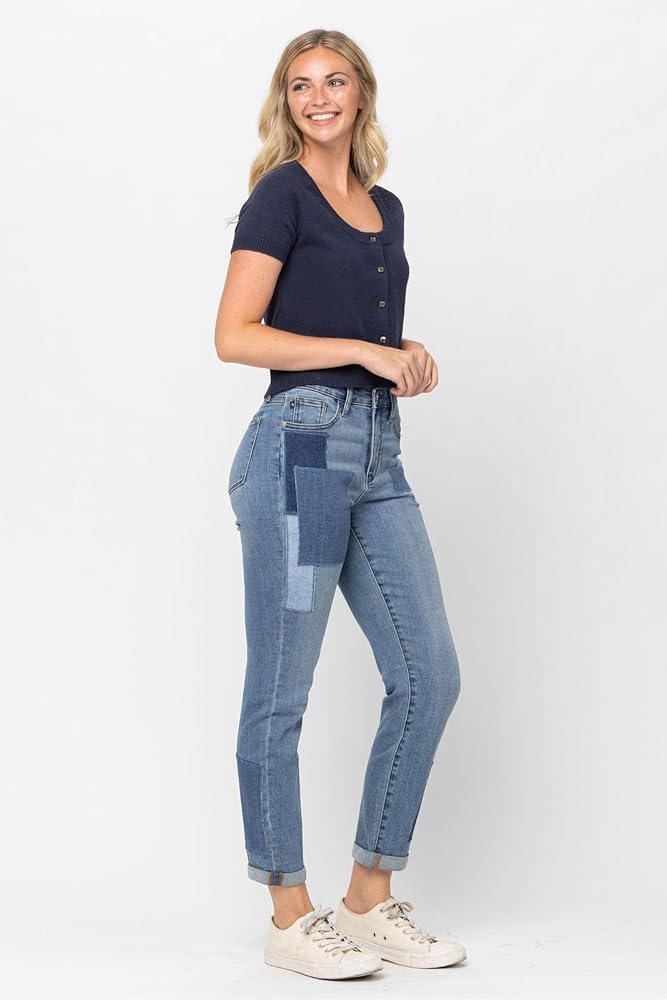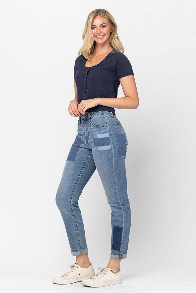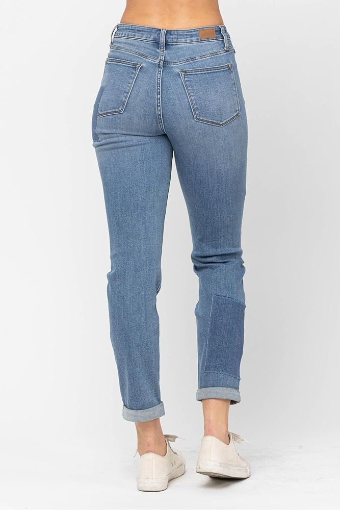The Judy Blue High Waist Double Rolled Cuff Patch Boyfriend Jeans are a stylish and comfortable addition to any denim collection. Crafted with a high-rise fit, these jeans flatter the waist while offering a secure, comfortable feel that moves with you. The distinct double rolled cuff design brings a relaxed, casual edge to these jeans, making them perfect for everything from a laid-back brunch to an evening out. These jeans stand out with unique patch detailing that gives them a vintage-inspired, trendy look. This patchwork design adds character without overpowering, making these jeans an easy choice for those looking to add subtle flair to their outfit. Constructed from a blend of 93% cotton, 6% polyester, and 1% spandex, these jeans are soft, durable, and comfortable enough for all-day wear. The added spandex offers a bit of stretch, giving you freedom of movement while maintaining their shape. Whether styled with a fitted blouse and heels or a cozy sweater and flats, these boyfriend jeans offer versatile fashion that transitions effortlessly from day to night.
