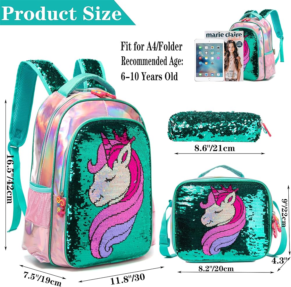 [Kids Backpack Capacity]Unicorn School backpack set including teens backpack,lunch box and pencil case,backpack contains 1 large main pocket with 1 zipper front pockets;2 mesh pocket for bottle;