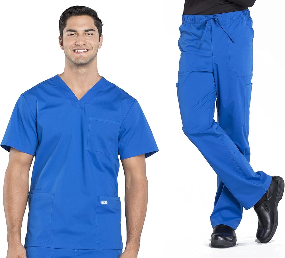 SPECIAL BUNDLE INCLUDES 2 ITEMS: Workwear Professionals Men Medical Uniform Scrub Bundle Set V-Neck Top WW695 & Tapered Leg Fly Front Cargo Pant WW190S
