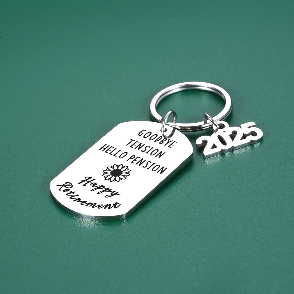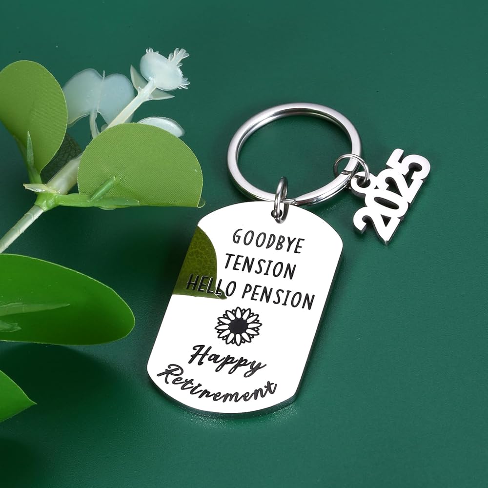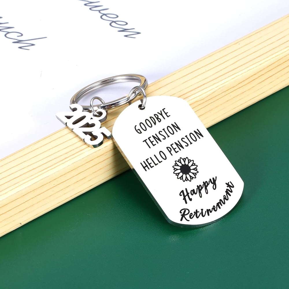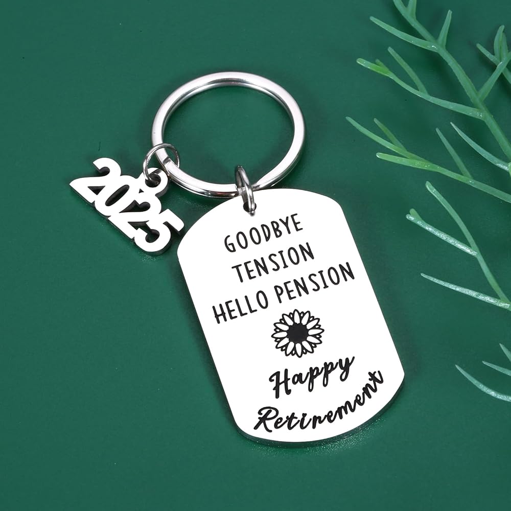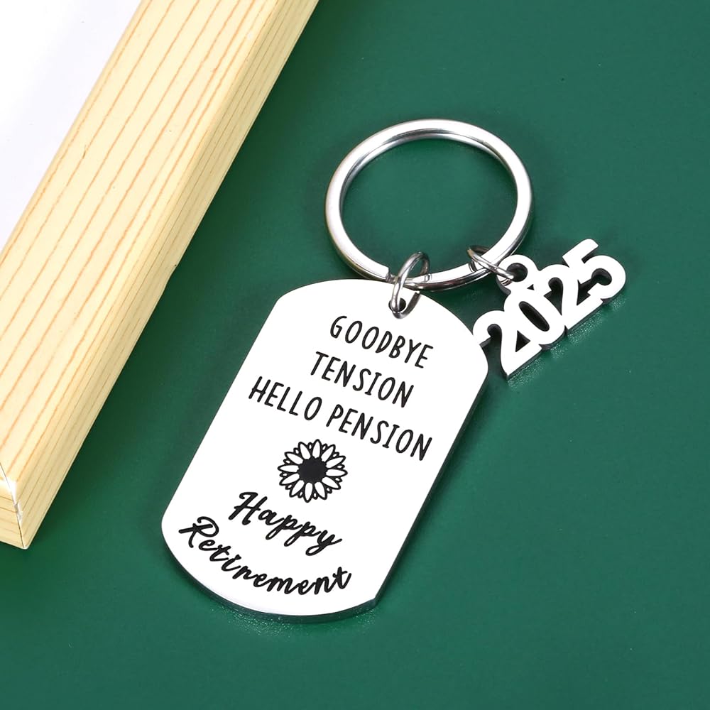 • Retirement Gifts for Men Women 2025: If you wanna find a gift for a retiring coworker or a coworker who will go away. The funny but lovely keychain engraved with"Goodbye Tension, Hello Pension, Happy Retirement." is a unique retirement gift for male boss, female boss, manager, men, women, nurses, doctors, pastors, coworkers, teachers, work friends, work besties, principals, employee, employer friend, sister, soulmate, soul sister, or the one who work with you and often help you.