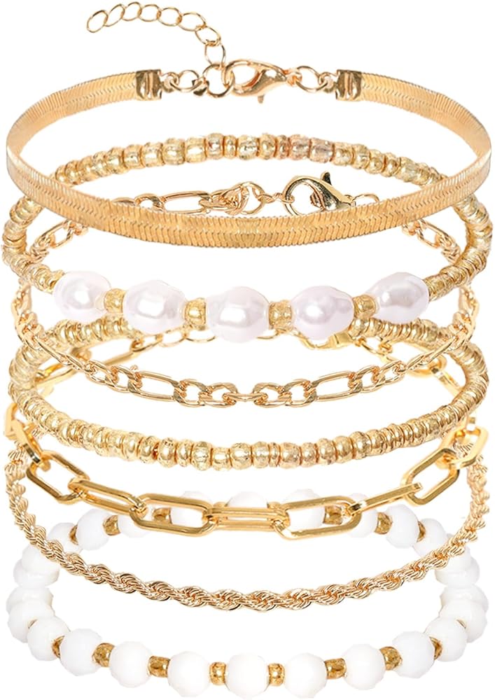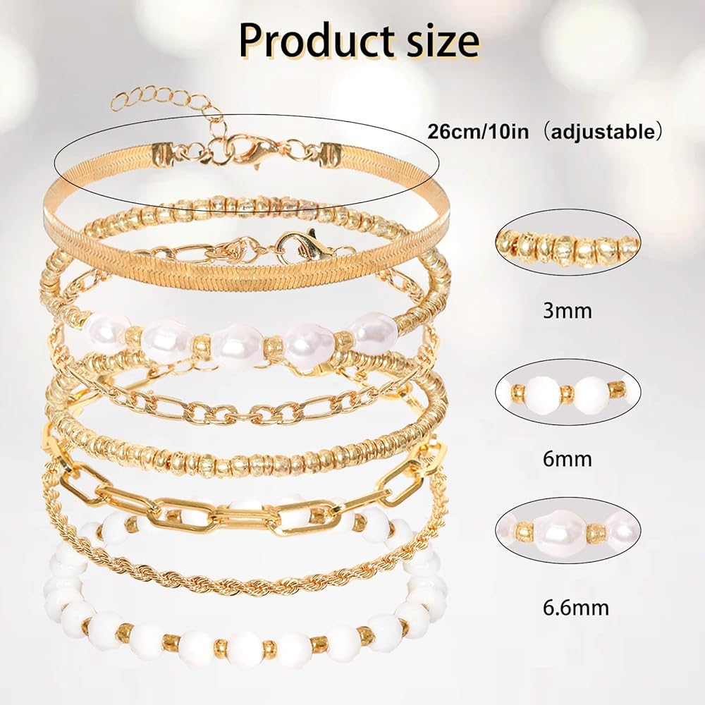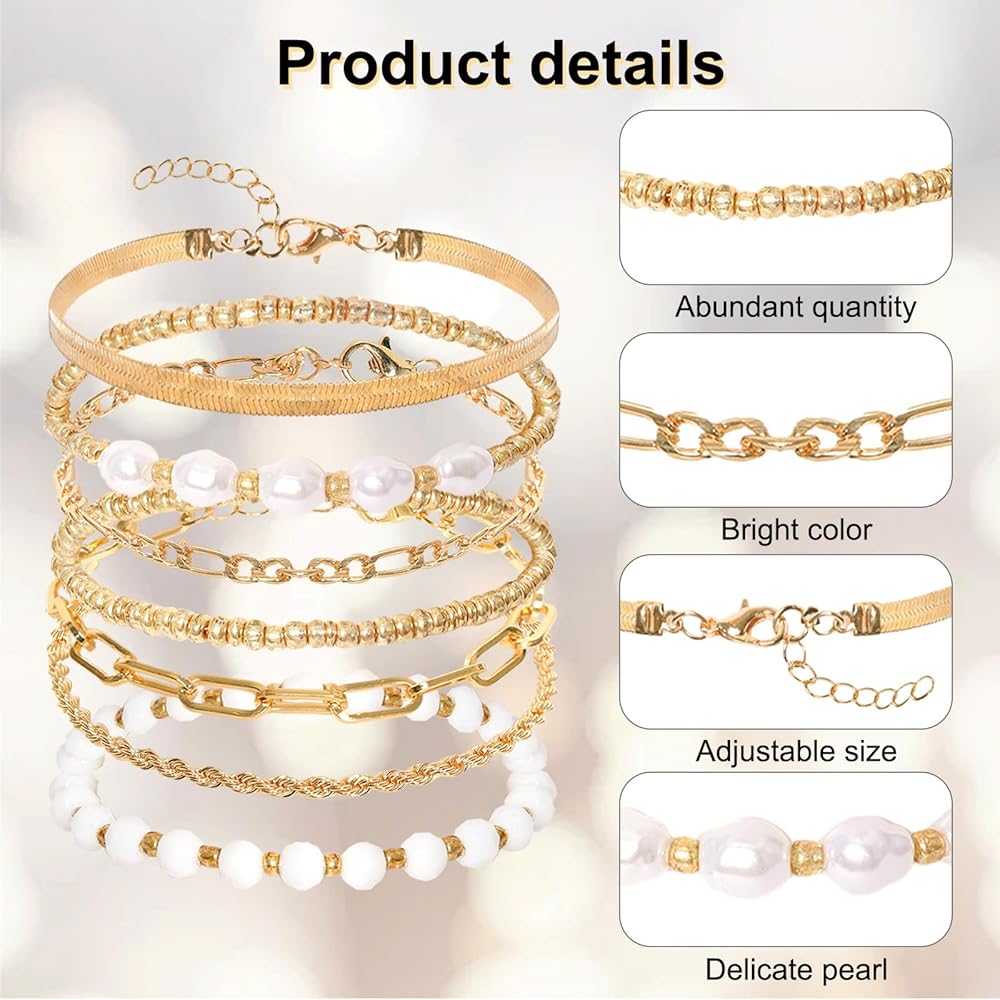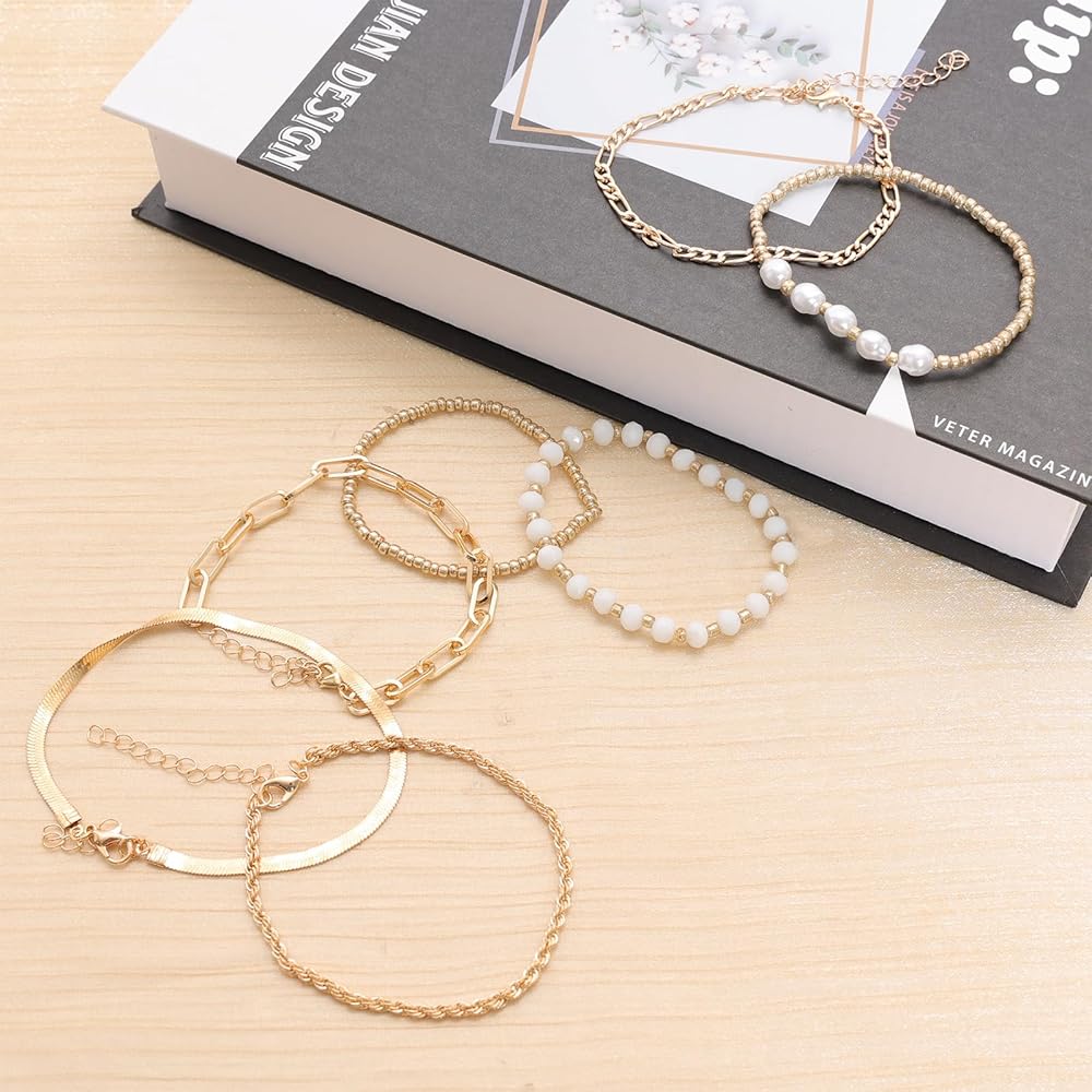 • Gold Bracelets for Women: This set contains 7 pcs elegant bracelets, offering you a wide range of choices to complement your style. Includes: 1pcs sparkling gold plated seed bead bracelet, 1pcs dazzling crystal bead bracelet, 1pcs unique paperclip link chain bracelet, 1pcs elegant gold bead with pearl beads bracelets, and 3 pcs bracelets anklets for women, each with a distinctive flavour