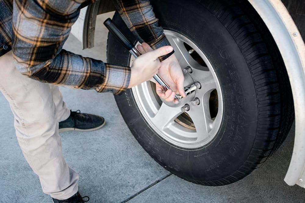 This is the world's BEST tool for changing a tire! Perfect for multi-axle vehicles and leaf spring axle trailers. It makes for quick and easy flat tire repair. Just drive up on the jack with the good tire and change away. The Rapid Jack lifts up 5-3/4 inches and can handle up to 30,000 lbs. This Kit Includes: - 1 Rapid Jack (Lifts 5-3/4 inches) with a Rubber Pad;- 1 Extendable Lug Wrench (extends from 14 to 21 ) ;- 2 Reversible sockets to fit 4 socket different sizes: 11/16 (17mm), 3/4 (19mm), 13/16 (21mm), 7/8 (22mm); - 1 Tuff Chock; - 1 Carry Bag;