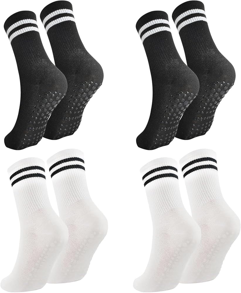 Enhance your workout routine with these long, non-slip yoga socks from CKKAPTURE. Designed with grips on the soles, these socks provide excellent traction, ensuring you maintain a secure footing during your Pilates, barre, or other fitness activities. The soft, breathable fabric offers superior comfort, while the sweat-absorbing properties keep your feet dry and prevent slipping. These mute socks allow you to move quietly, without the distracting noise of bare feet on the floor. With four pairs included, you'll have a fresh set for every workout session. Prioritize your safety and performance with these versatile, high-quality yoga socks.