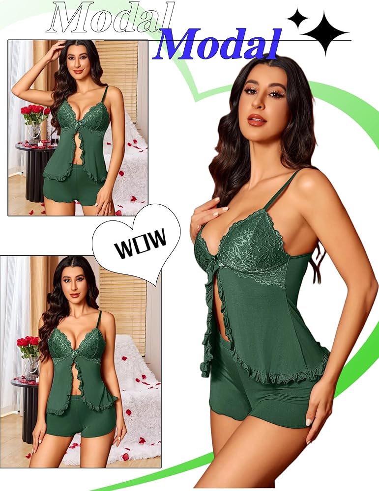 التصميم: تتميز مجموعة السراويل البيجامة النسائية بكوب دانتيل مثير برقبة على شكل حرف V وتصميم حاشية أمامية مفتوحة. الدانتيل الموجود على الأكواب والمقطع أسفل الصدر يضفي جانبًا رومانسيًا ومثيرًا. الشورت أيضًا ناعم للغاية وتضفي التفاصيل المكشكشة عليه القدر المناسب من الإثارة. بشكل عام، هذه التفاصيل تشبه الإدلاء ببيان مثير دون محاولة ذلك.