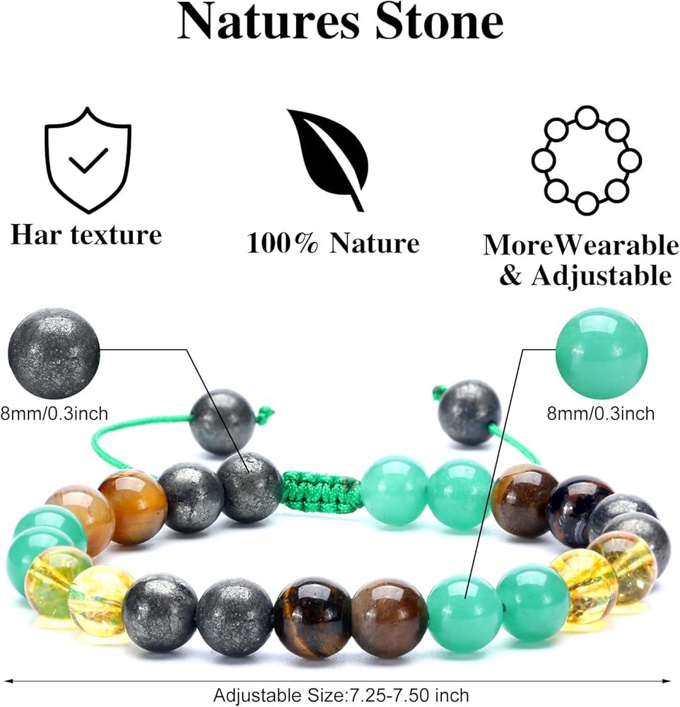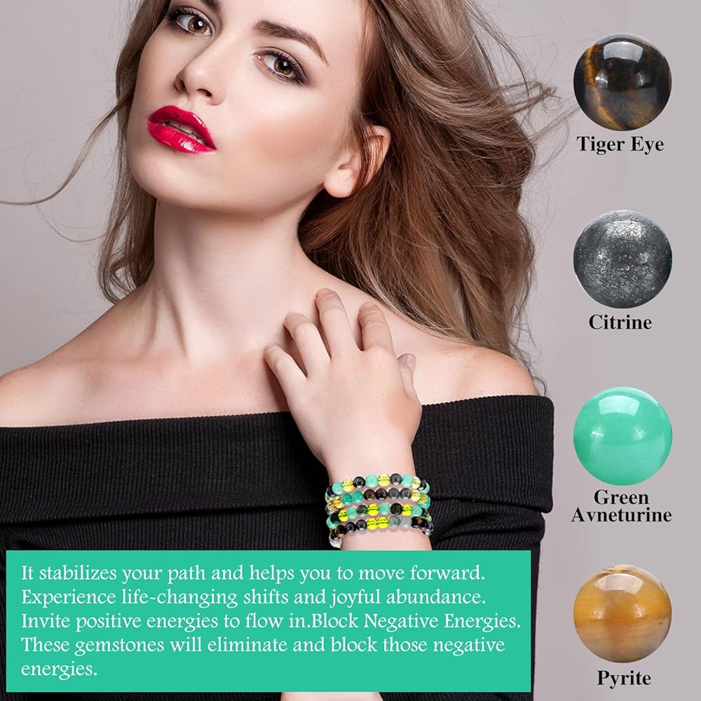 Each of our bracelets is carefully made with a mix of Citrine, known as the success stone, Pyrite for attracting wealth, and Green Aventurine for good luck and blessings. This special combination makes our bracelet a positive energy