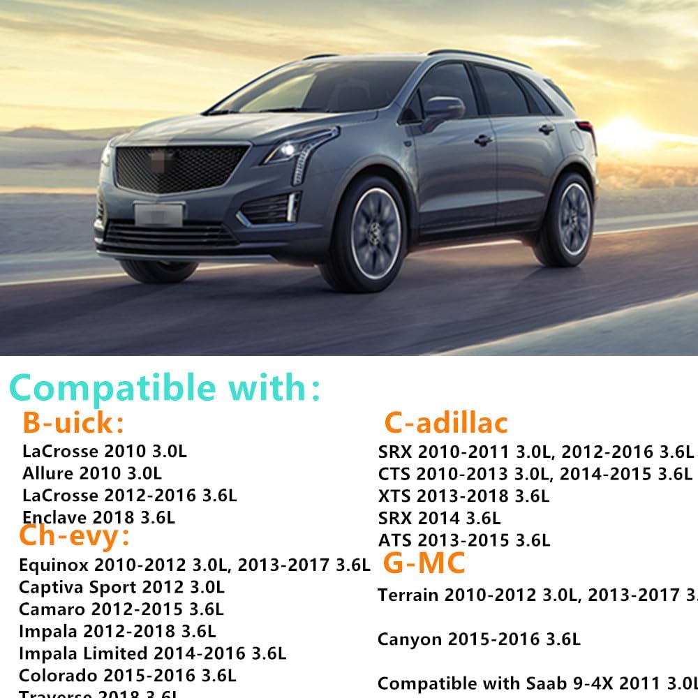 • متوافق مع: لـ Buick 3.0L Allure LaCrosse CX/CLX 2010، لـ Enclave 3.6L 2018-2022، لـ LaCrosse 3.6L 2012-2016؛ لكاديلاك CTS 3.0L 2010-2014، لـ SRX 3.0L 2010-2011، لـ ATS 3.6L 2013-2015، لـ CTS 3.6L 2012-2015، لـ SRX 3.6L 2012-2016، لـ XTS 3.6L 2013-2019؛ لشيفي كابتيفا 3.0L 2012، لـ Equinox 3.0L 2010-2012، لـ Equinox 3.6L 2013-2017، لـ Impala 3.6L 2012-2020، لـ Traverse 3.6L 2018-2022؛ لسيارة جي إم سي تيرين 3.0L 2010-2012، لسيارة تيرين دينالي/SLE/SLT 3.6L 2013-2017; لساب 3.0L 9-4X 2011.