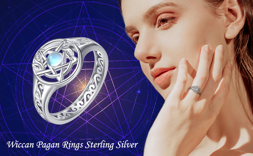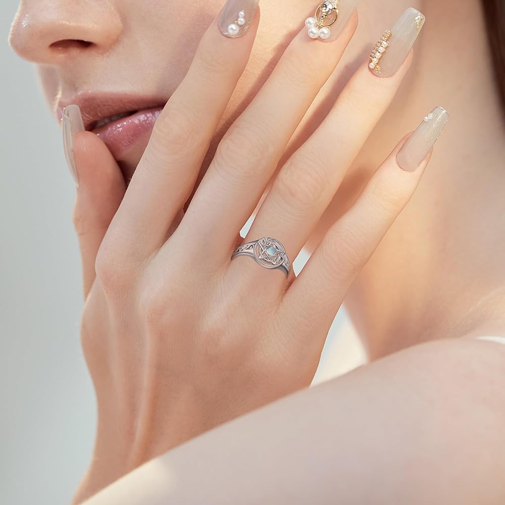 • ⭐S925 Material: Pentagram ring is made of 925 sterling silver, decorated with synthetic moonstone. It won't fade. Lead-free, nickel-free, and anti-allergy. A right thickness, is strong , not easy to break, cool, and comfortable.